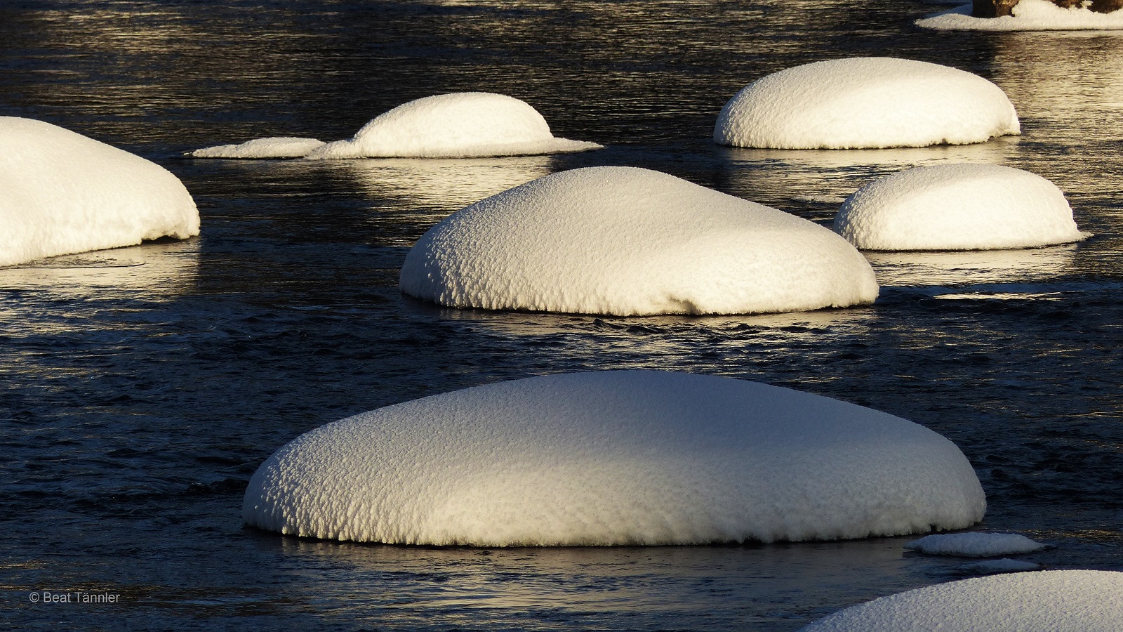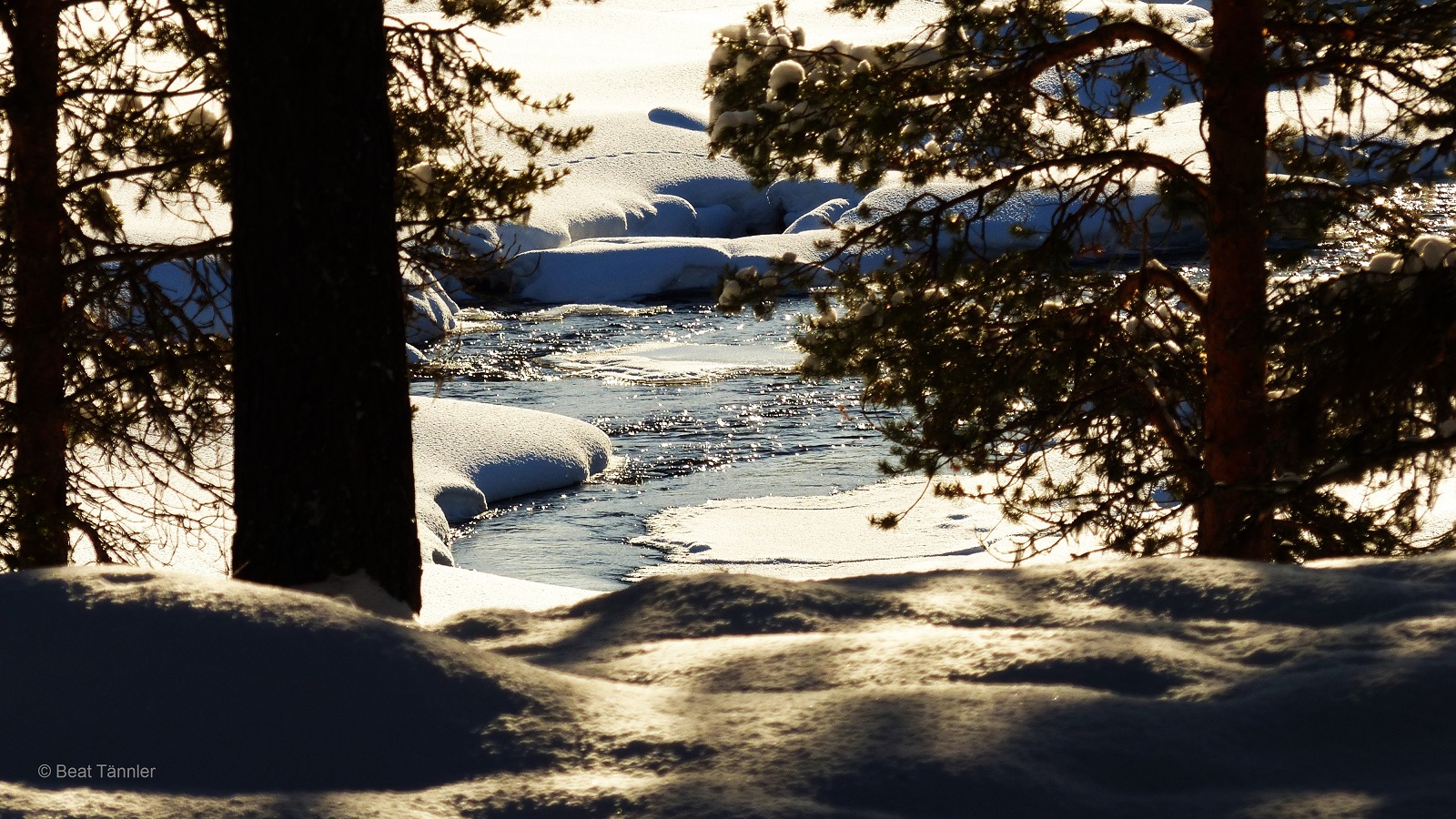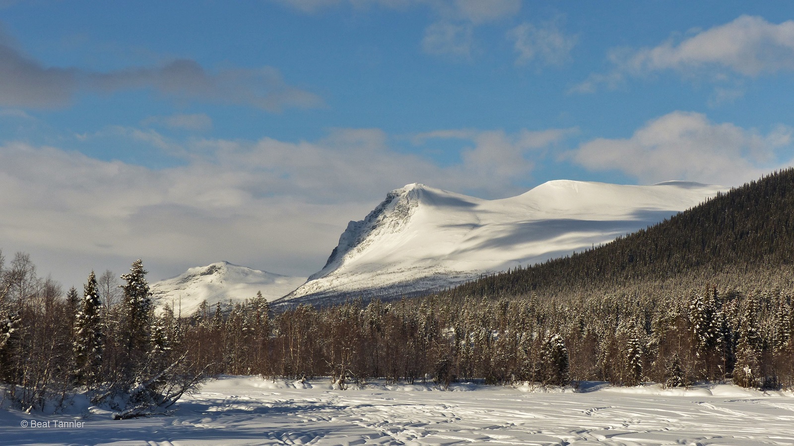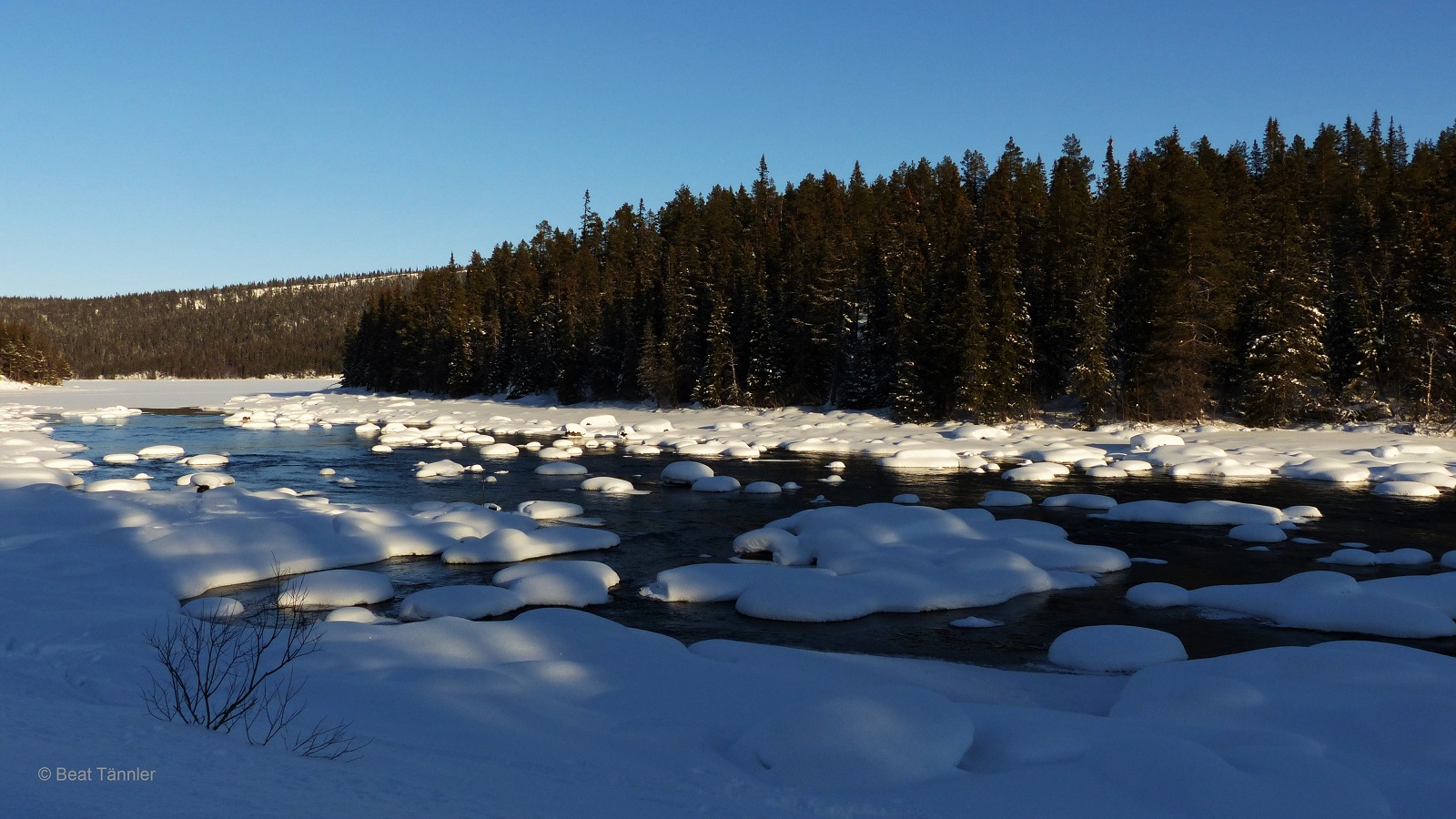 Auf der anderen Seite fahren wir durch einen Mischwald. Auf einer abgebrochenen Birke hat sich ein hoher Schneeberg angesammelt und sorgt so für eine naturgemachte Skulptur.