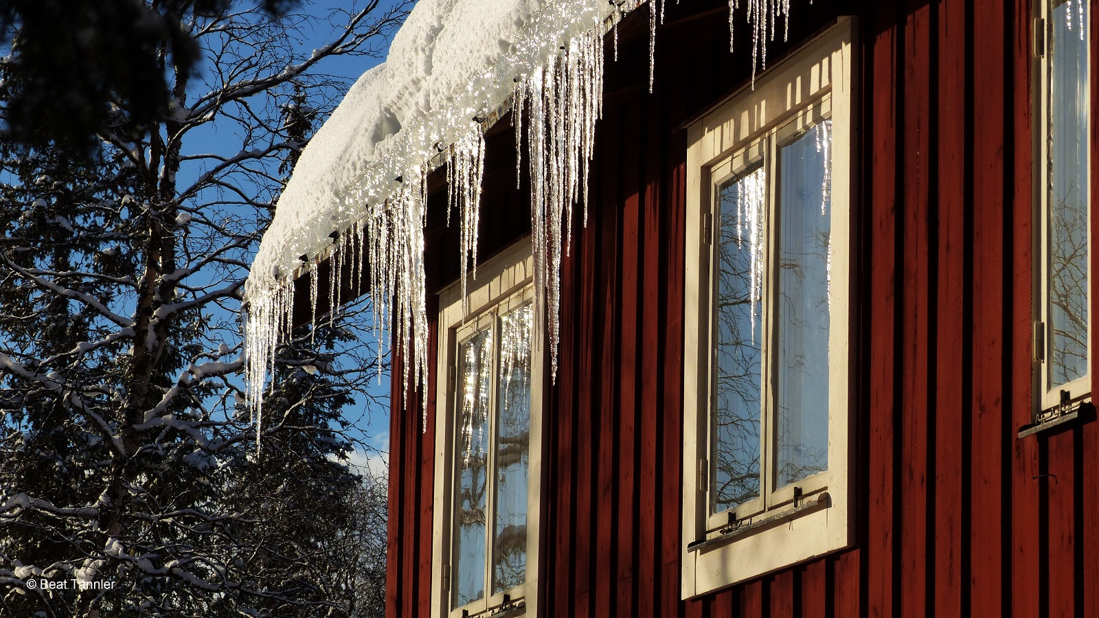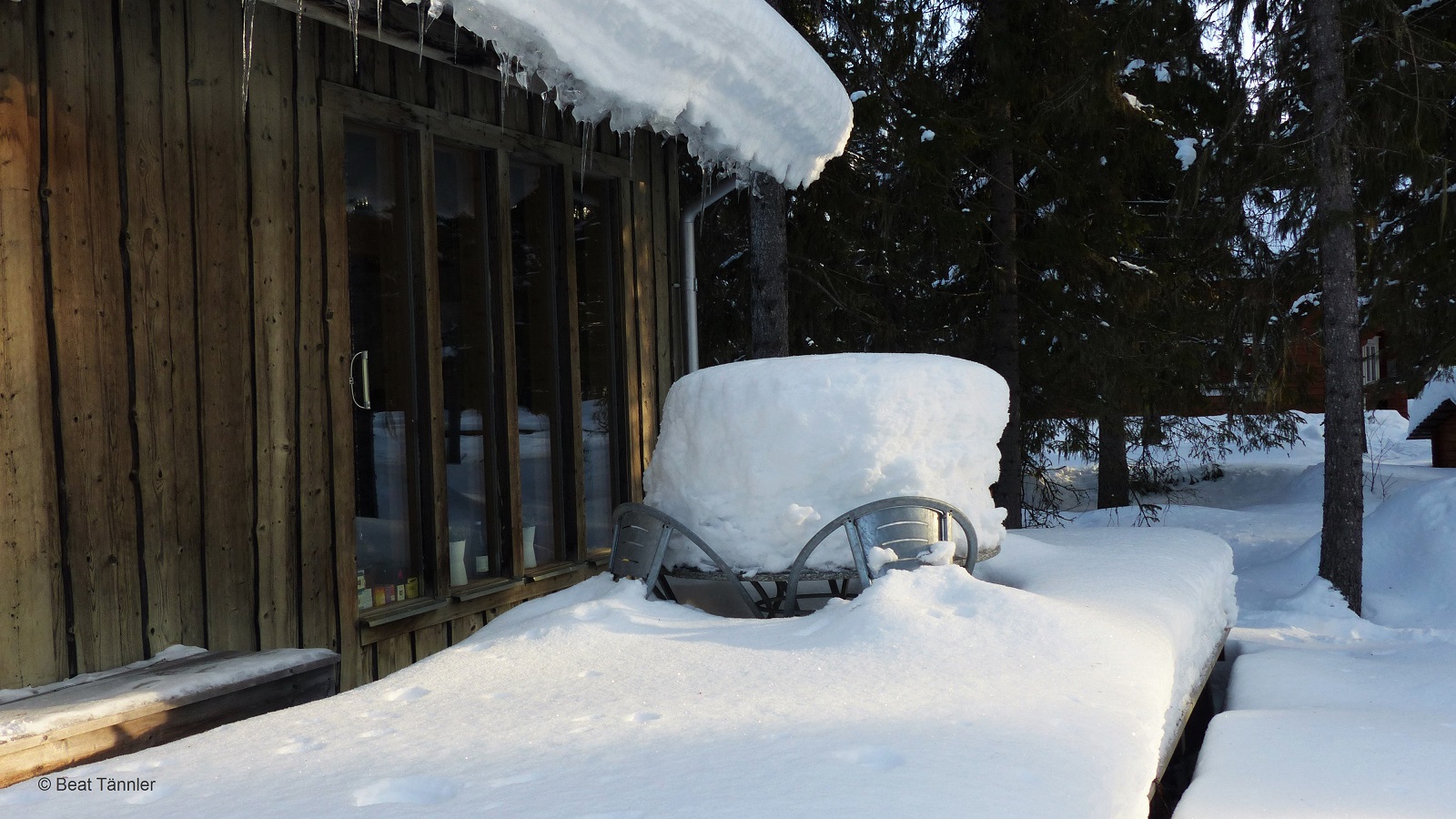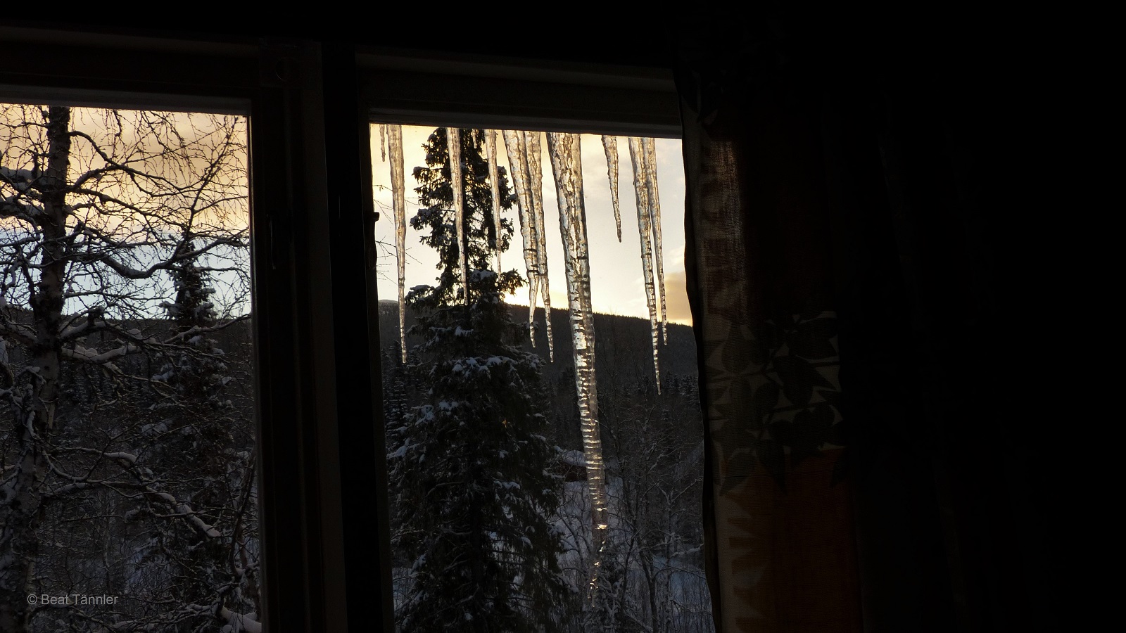 Vor dem Fenster hängen einige imposante Eiszapfen. Das sind die ersten Frühlingsboten Lapplands. Sie zeigen, dass es tagsüber an exponierten Stellen bereits Temperaturen von über 0°C gegeben hat.