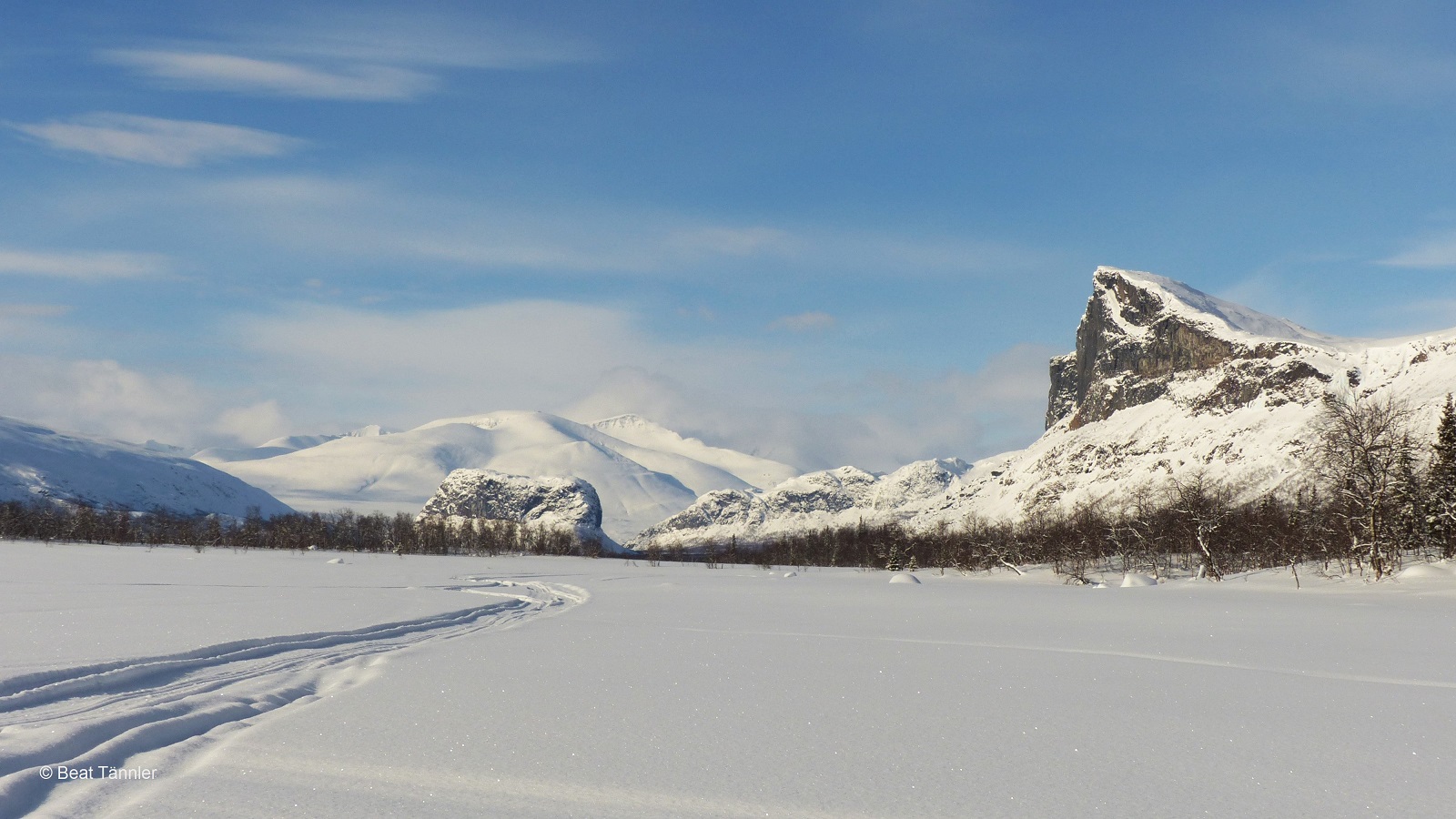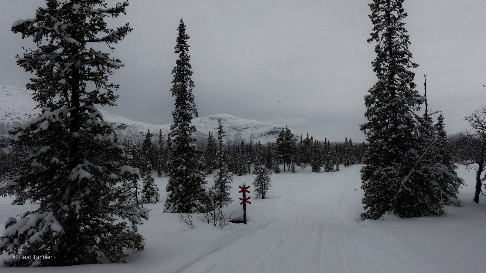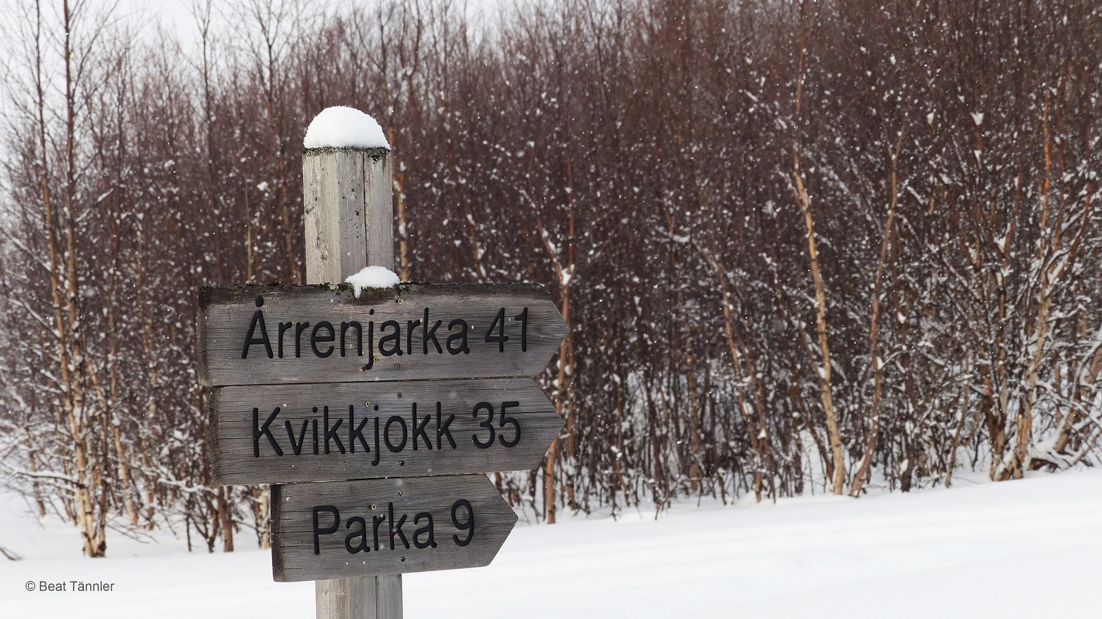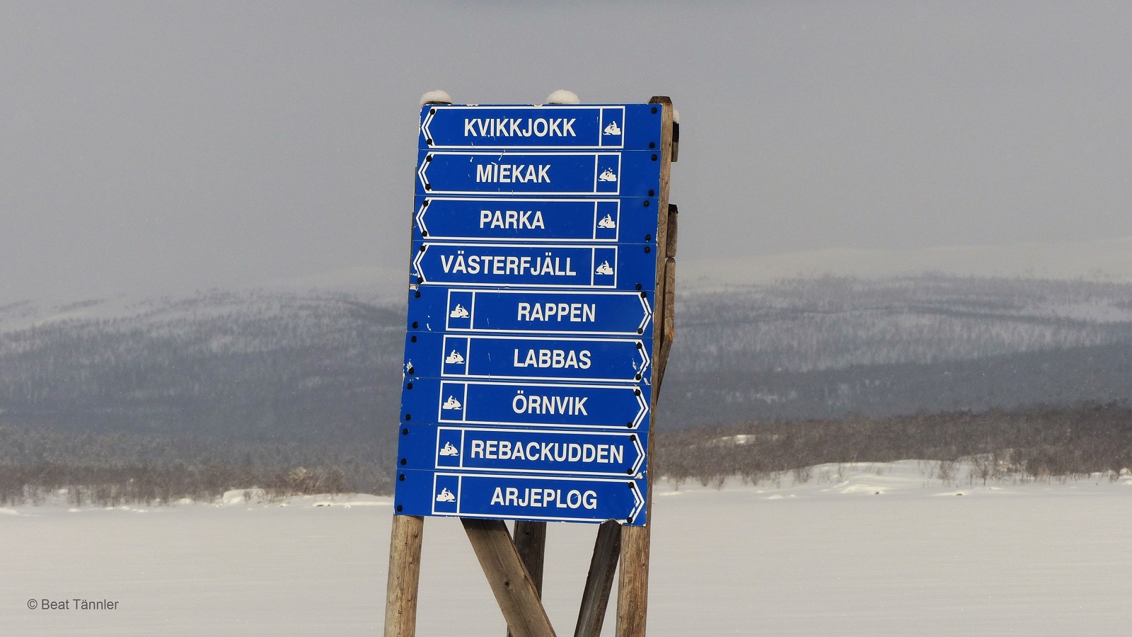 Zuerst führt der Trail über den See Tjeggelvas. Hier steht im Winter ein Wegweiser mitten auf dem gefrorenen See.