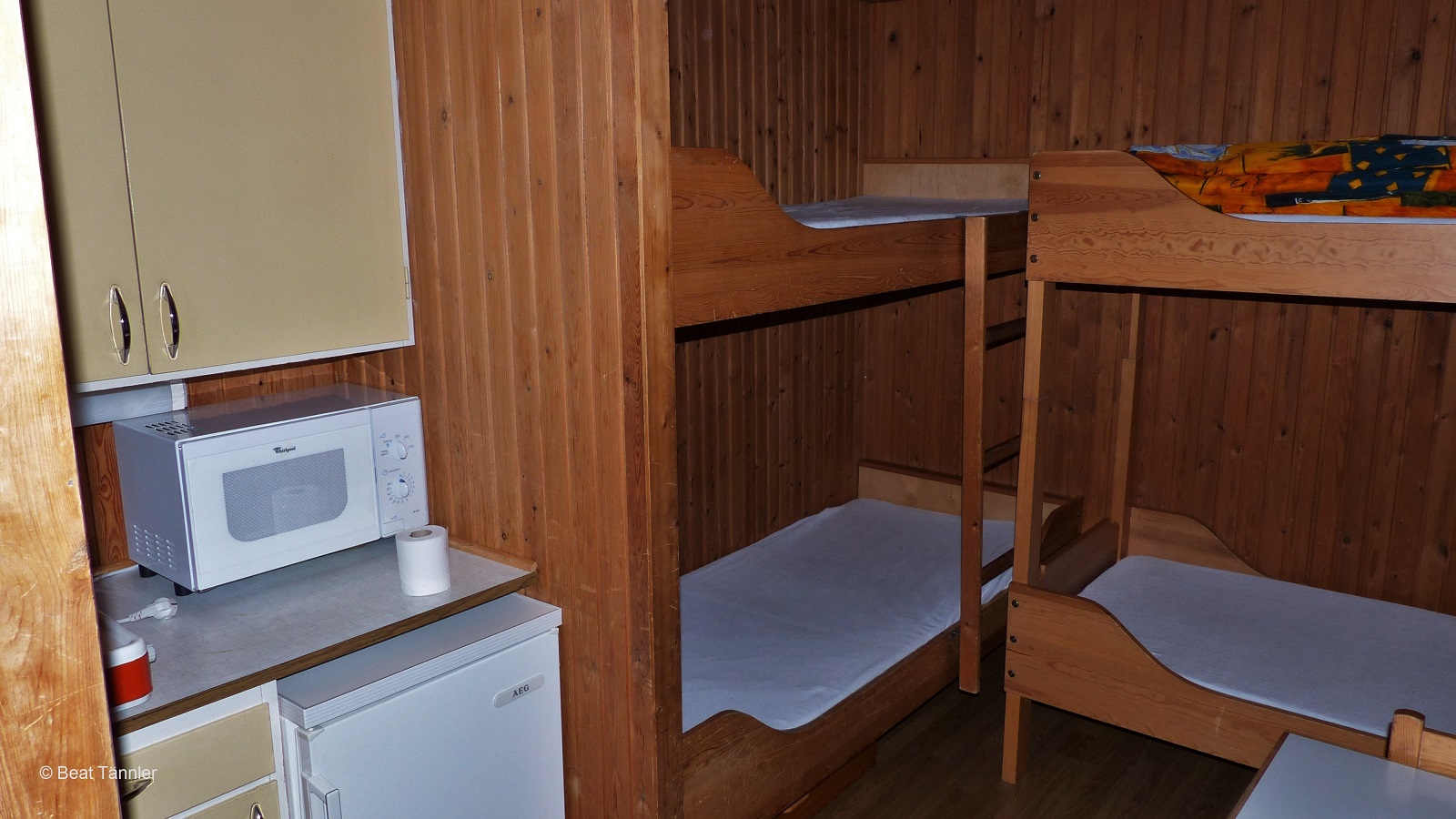 Diese ist wie eine SAC-Hütte aufgebaut. Von einem Gemeinschaftsraum mit Kochgelegenheit gelangt man in zwei Zimmer mit Kajütenbetten. Das Plumpsklo ist in einem Nebengebäude untergebracht. Das Wasser wird vom Bach geholt. Man lässt grosse Kanister volllaufen und zieht diese an Seilen hinter sich her.