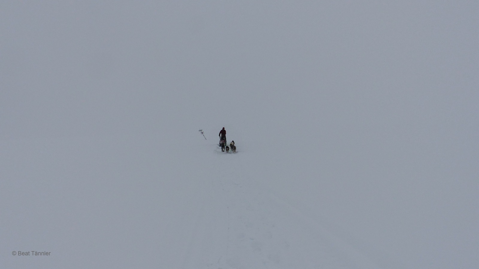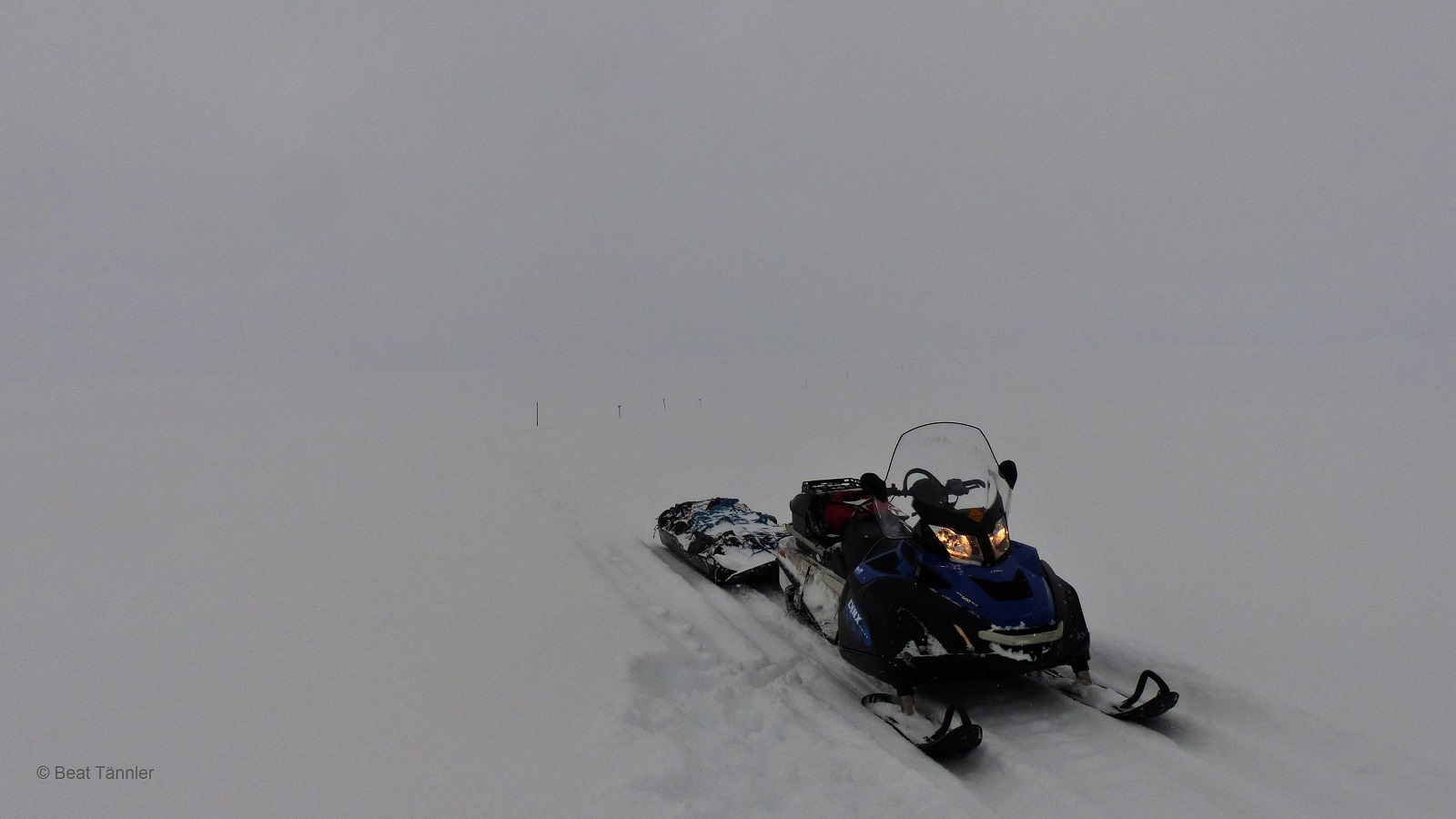 Auf dem Kabla wartet Beat mit dem Schneemobil im Nebel auf die Hundegespanne und geniesst die meditative Stille im „Nichts“.