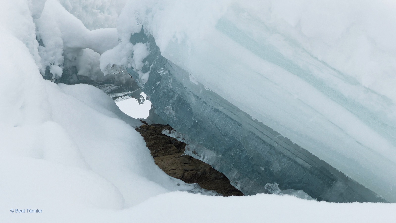 Die Strecke führt über den Tjaktjajaure zwischen aufgebrochenen Eisplatten hindurch. Man wähnt sich auf einem Gletscher. Zum Glück wird der Weg regelmässig kontrolliert und wenn nötig umgeleitet. Auf beiden Seiten des Flusses stehen Tafeln. Hier werden jeweils: Datum der Kontrolle, Eisdicke und Name der Kontrollperson eingetragen.