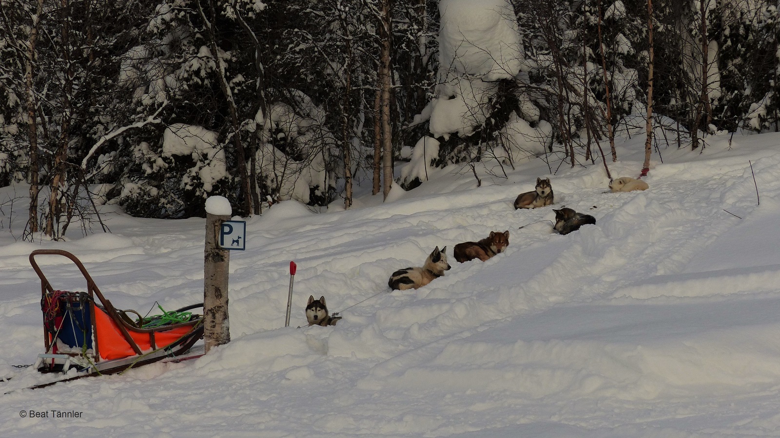 Für die Schlittenhunde gibt es hier einen „Parkplatz“ und Pfosten, an denen man die Stake-Outs befestigen kann. Doch jetzt sind wir müde und darum folgt das Bild dazu erst morgen.