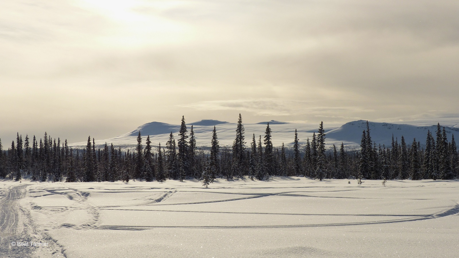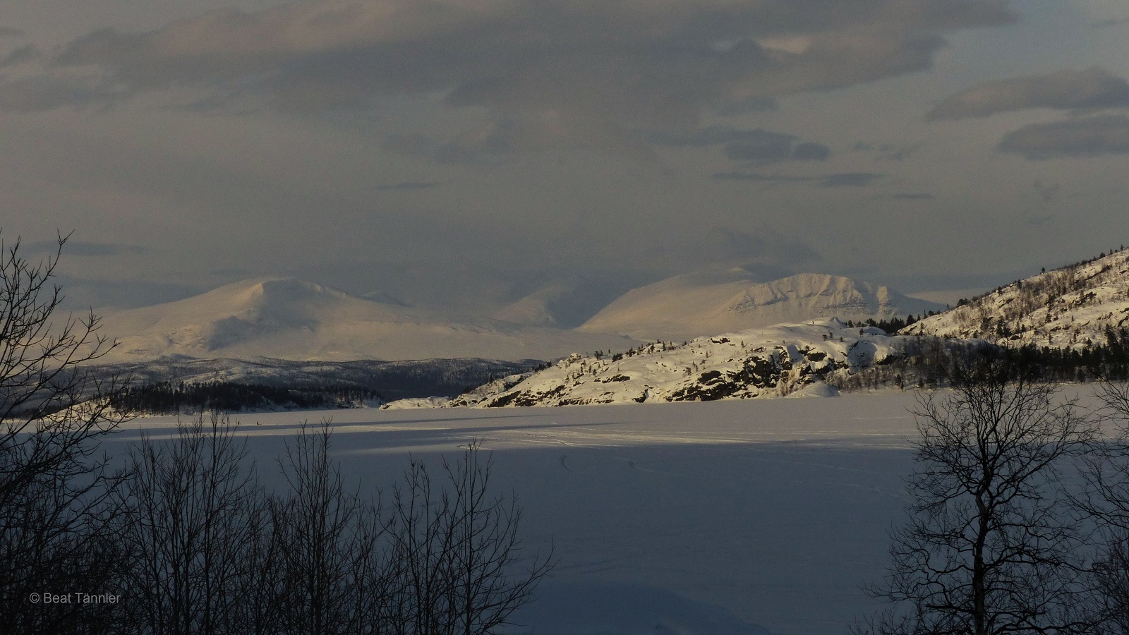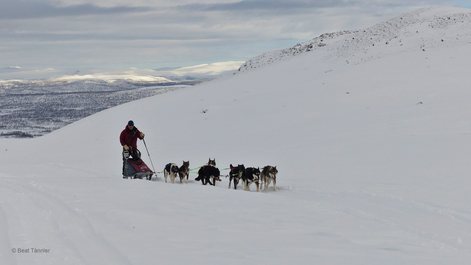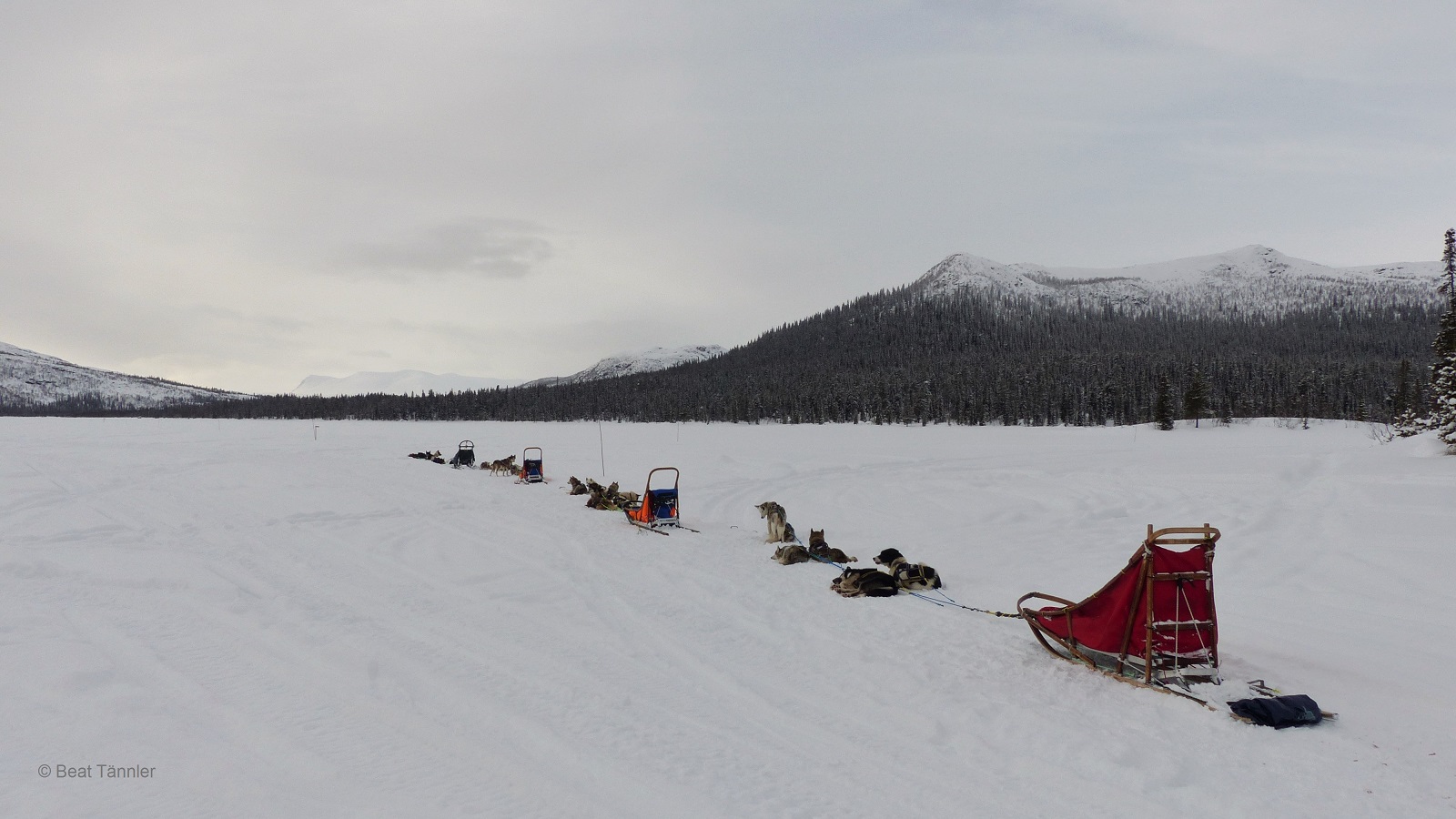 Von hier fahren wir noch ca. neun Kilometer auf dem See Tjeggelvas zurück nach Örnvik, wo wir Hunde und Material wieder auf die Anhänger verladen und nach Sorsele heimkehren.