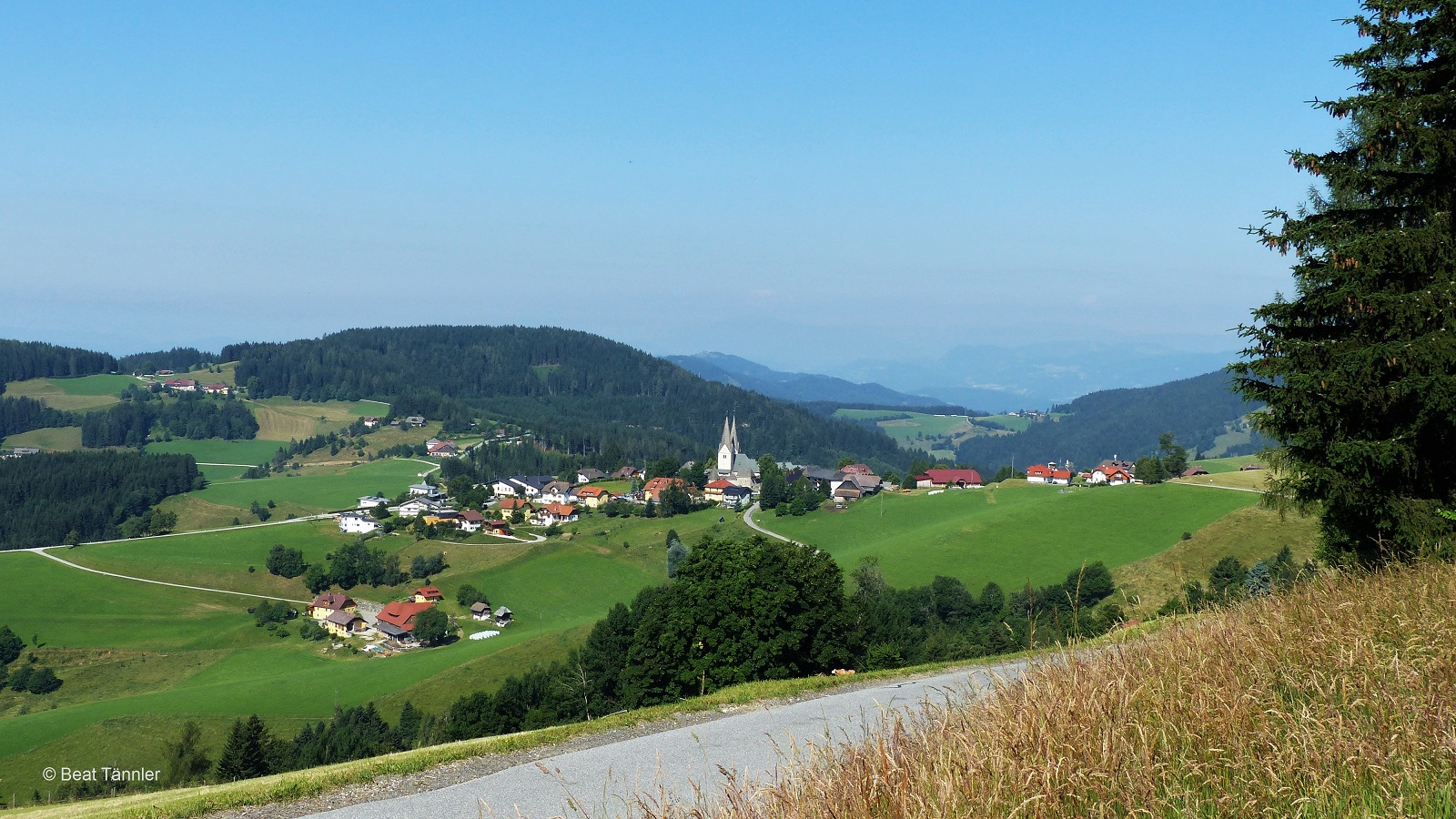 Wir lassen den Blick über Felder und Wiesen schweifen bis uns plötzlich ein Ortsschild ins Auge fällt: „Kirchschlag in der Buckligen Welt“!