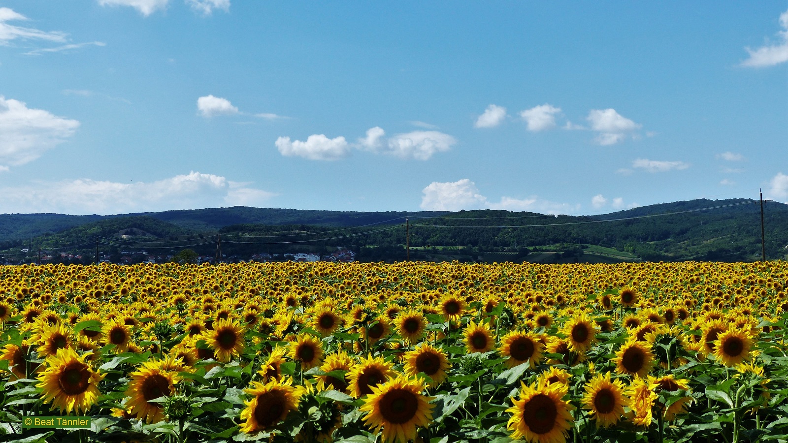 Unterwegs leuchten einige Sonnenblumenfelder in freundlichem Gelb.