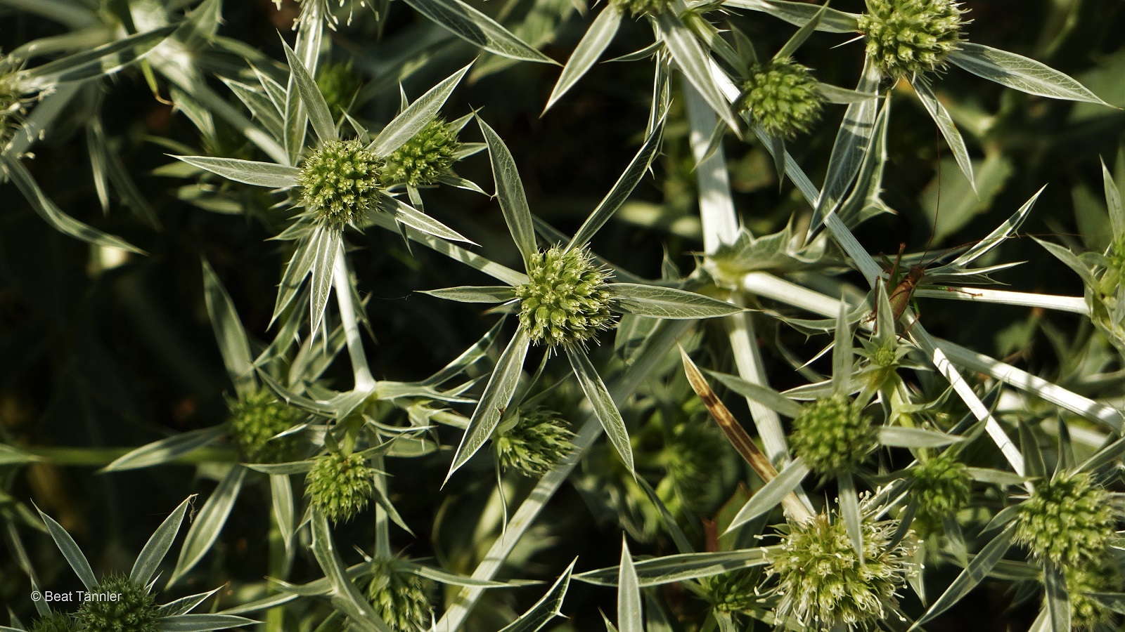 Daneben wächst eine dekorative grüngräuliche Pflanze, die sich mit ihren spitzen dornenbesetzten Blättern Fressfeinde vom Leibe hält. Die Sonne brennt erbarmungslos auf die Erde nieder, was diese Pflanze zu lieben scheint.
