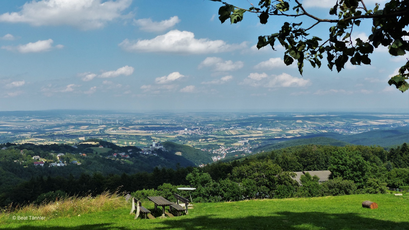 Langsam wird das Land wieder hügeliger. Nach Forchtenstein legen wir einen Stopp ein und spazieren zur Rosalienkapelle, wo man einen wunderschönen Blick über die Tiefebene Österreichs geniesst.