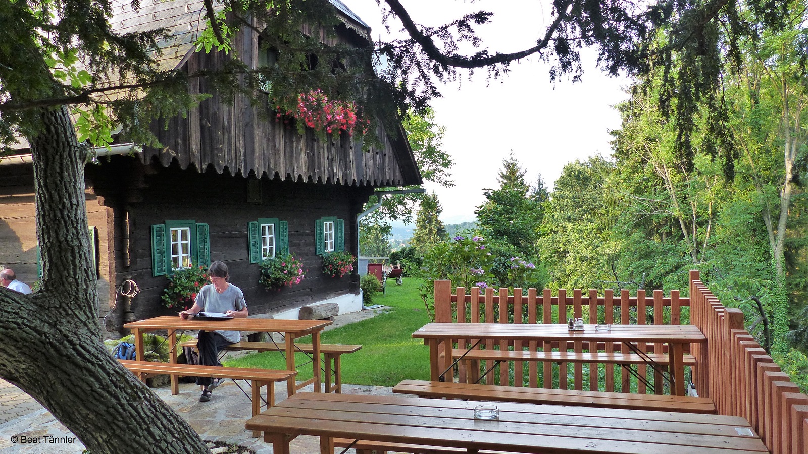 Kurz nach Arnfels entdecken wir den Wegweiser „Zur Altenbachklamm“. Von Neugier getrieben fahren wir dorthin. Vor dem Einstieg zur Klamm liegt ein Buschenschank. Wir beschliessen dort einzukehren, aber erst nach der Wanderung.