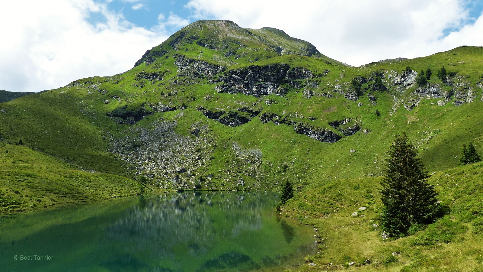 Oben, über der Baumgrenze, rasten wir an dem idyllisch gelegenen Alpsee. Die Ruhe, die er ausstrahlt, überträgt sich auch auf uns.