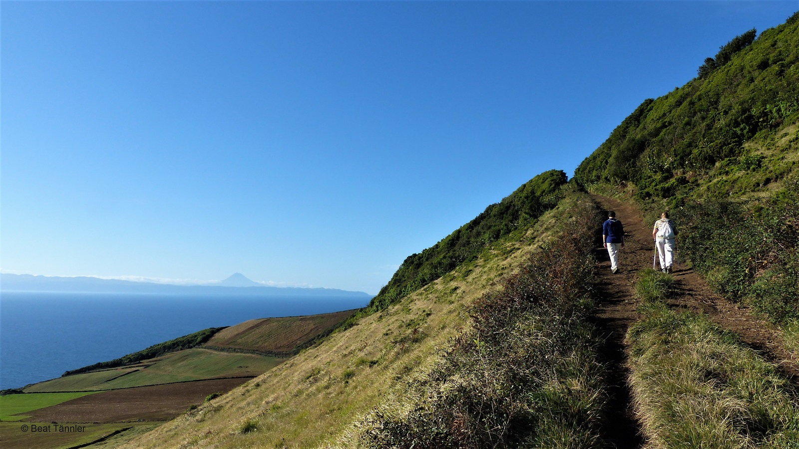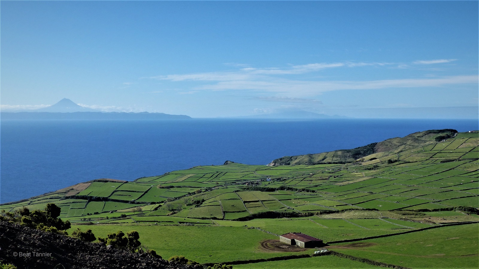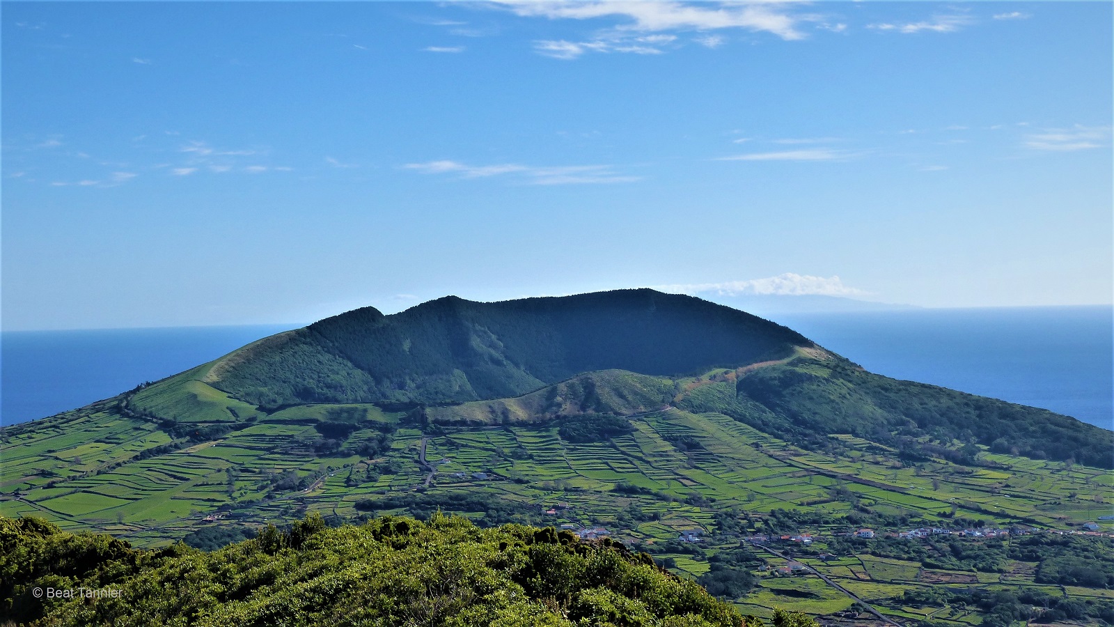 Vom Gipfel aus geniesst man einen wunderschönen Blick auf die hier typischen, mit Mauern aus schwarzem Lavastein eingefassten Weideflächen. Dahinter grüsst die langgezogene Insel São Jorge und der noch weiter entfernte Pico von der gleichnamigen Insel.