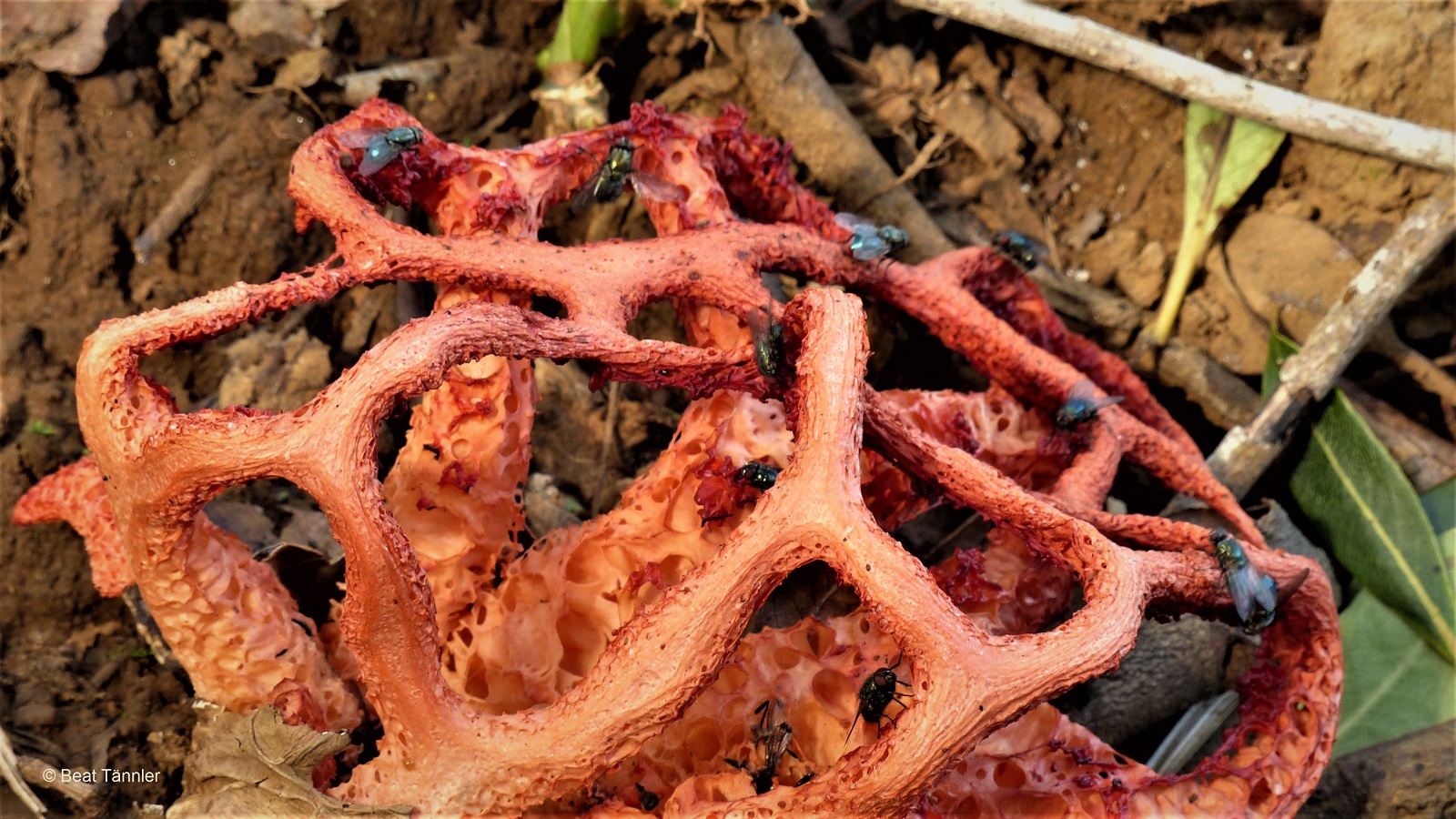 Das netzartige Gebilde riecht nach Aas und scheint das Ausflugsziel vieler Fliegen zu sein.