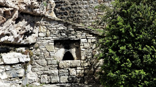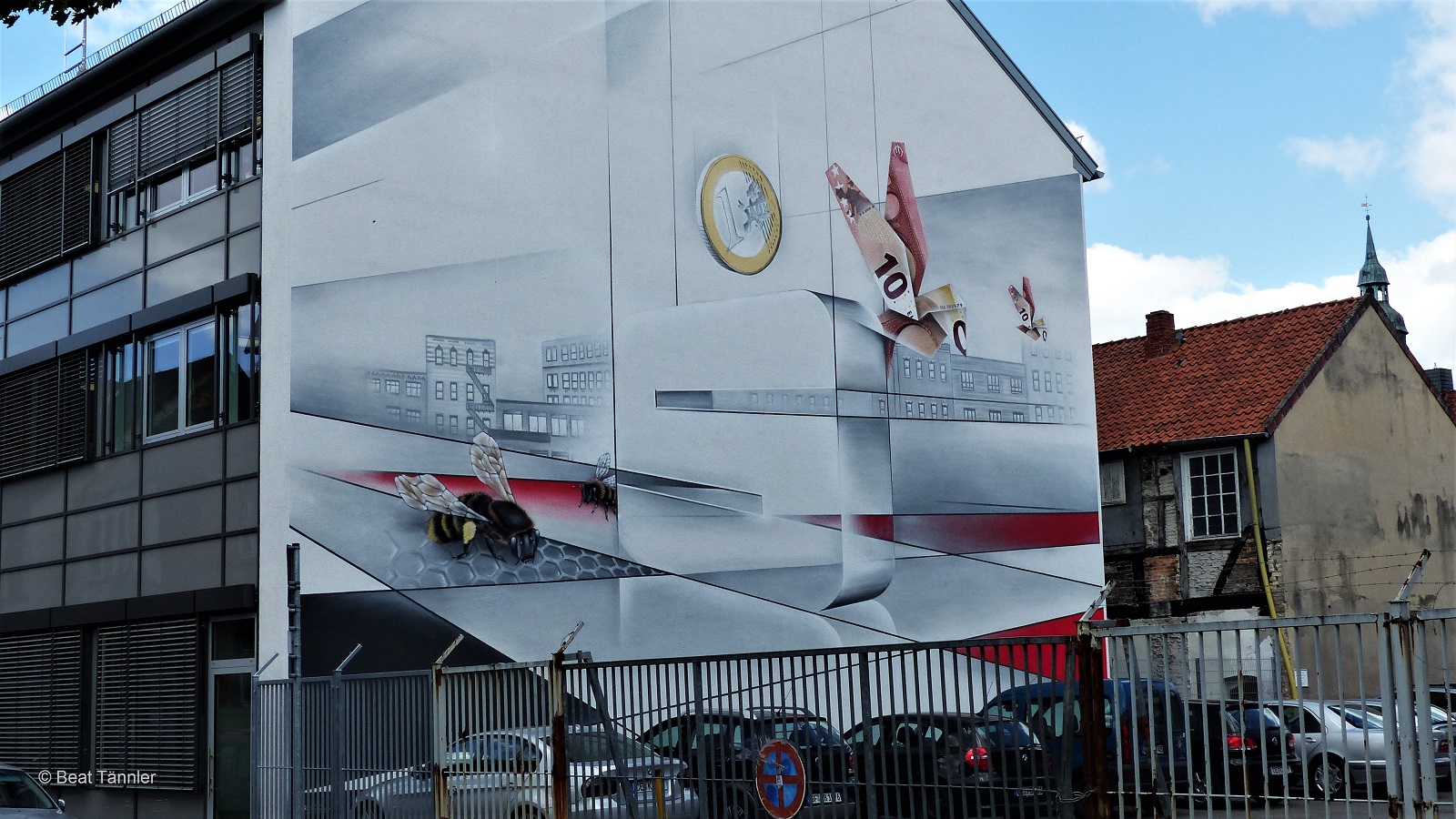 Ausserhalb der Kernzone ist genügend Platz für Neubauten. Das Wandgemälde einer Bank ist uns besonders aufgefallen.