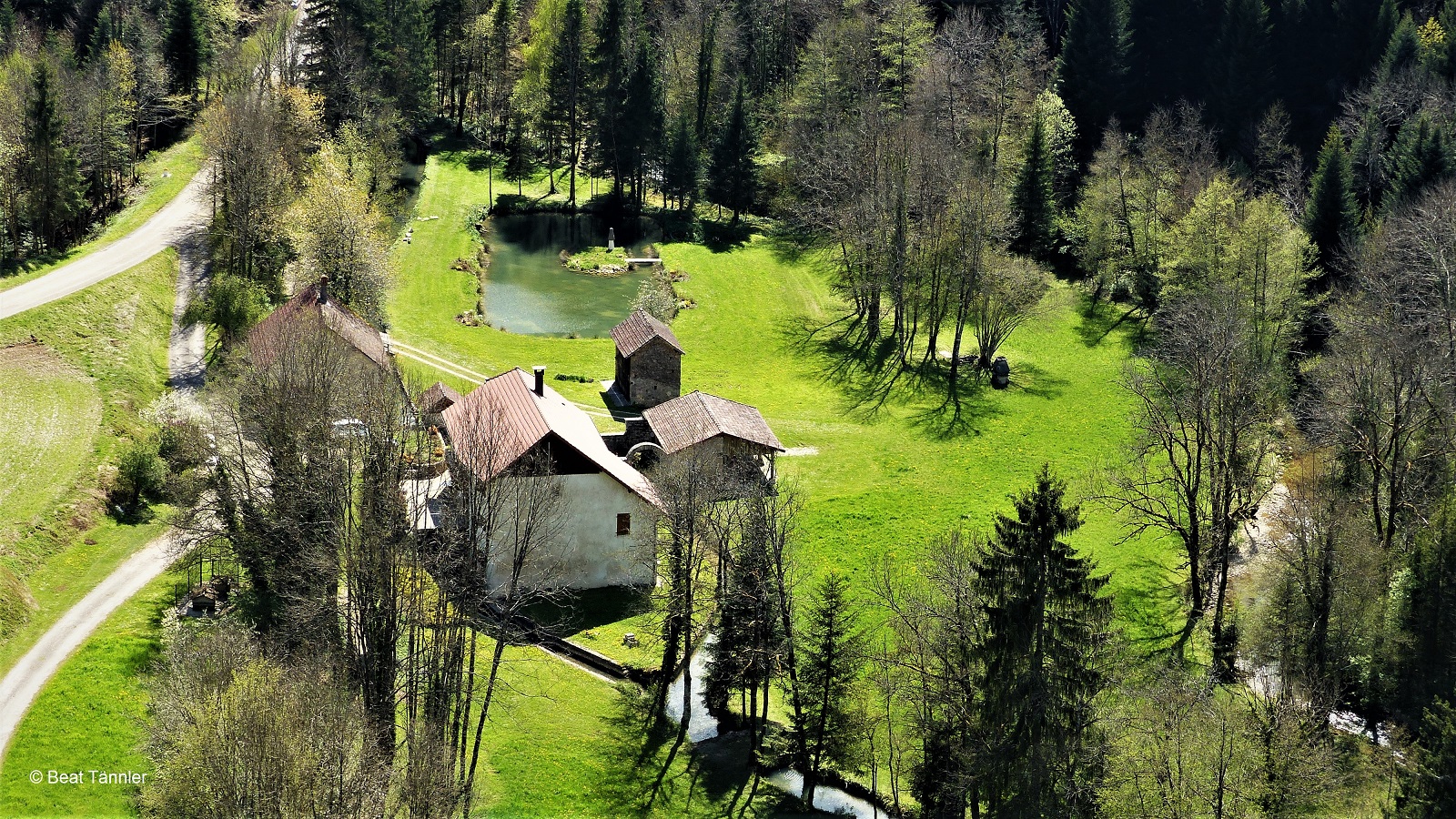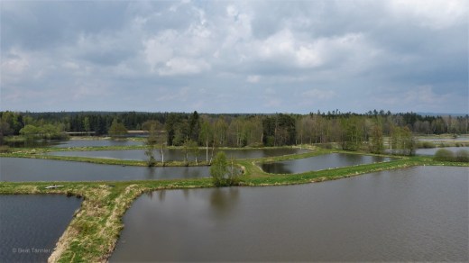 Von oben geniesst man den Blick über einige der Teiche, in denen noch heute Karpfen gezüchtet werden.