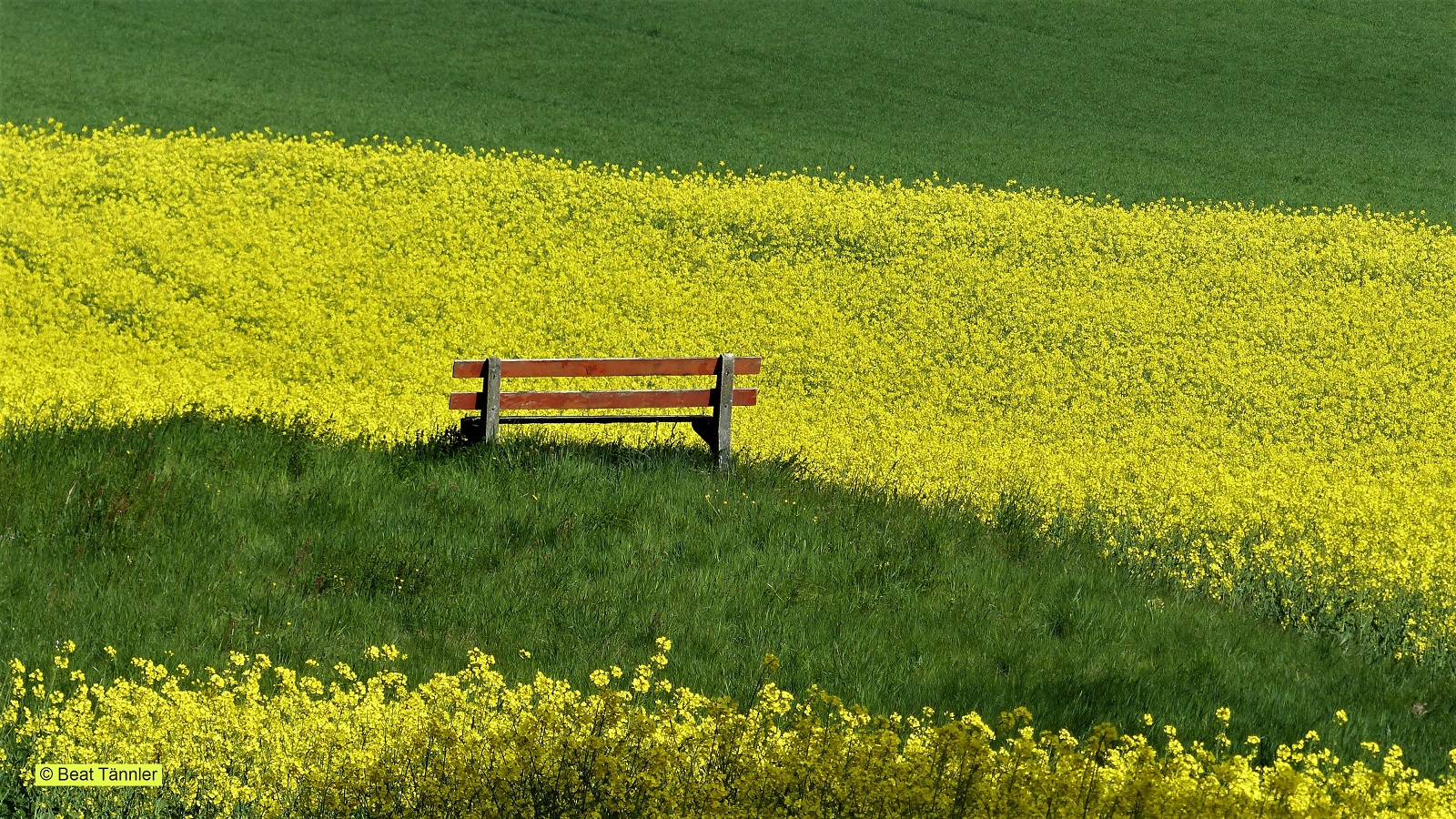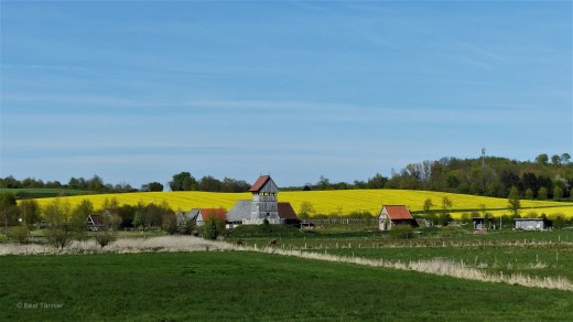 Die Rapsfelder stehen in voller Blüte und geben für die Turmhügelburg einen schönen Hintergrund ab.