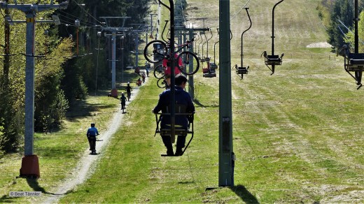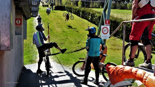 Dieser Berg scheint das Ziel aller Mountainbike-Fahrer von nah und fern zu sein. Neben dem Sessellift, der mehr Biker befördert als Wanderer, zieht auch ein Skilift die Radfahrer den Berg hoch.