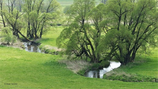 Nach so vielen Karpfenteichen wollen wir zum Abendbrot diesen Fisch essen. Deshalb fahren wir zurück ins Dorf, wo wir einen schönen Platz am Netzbach finden.