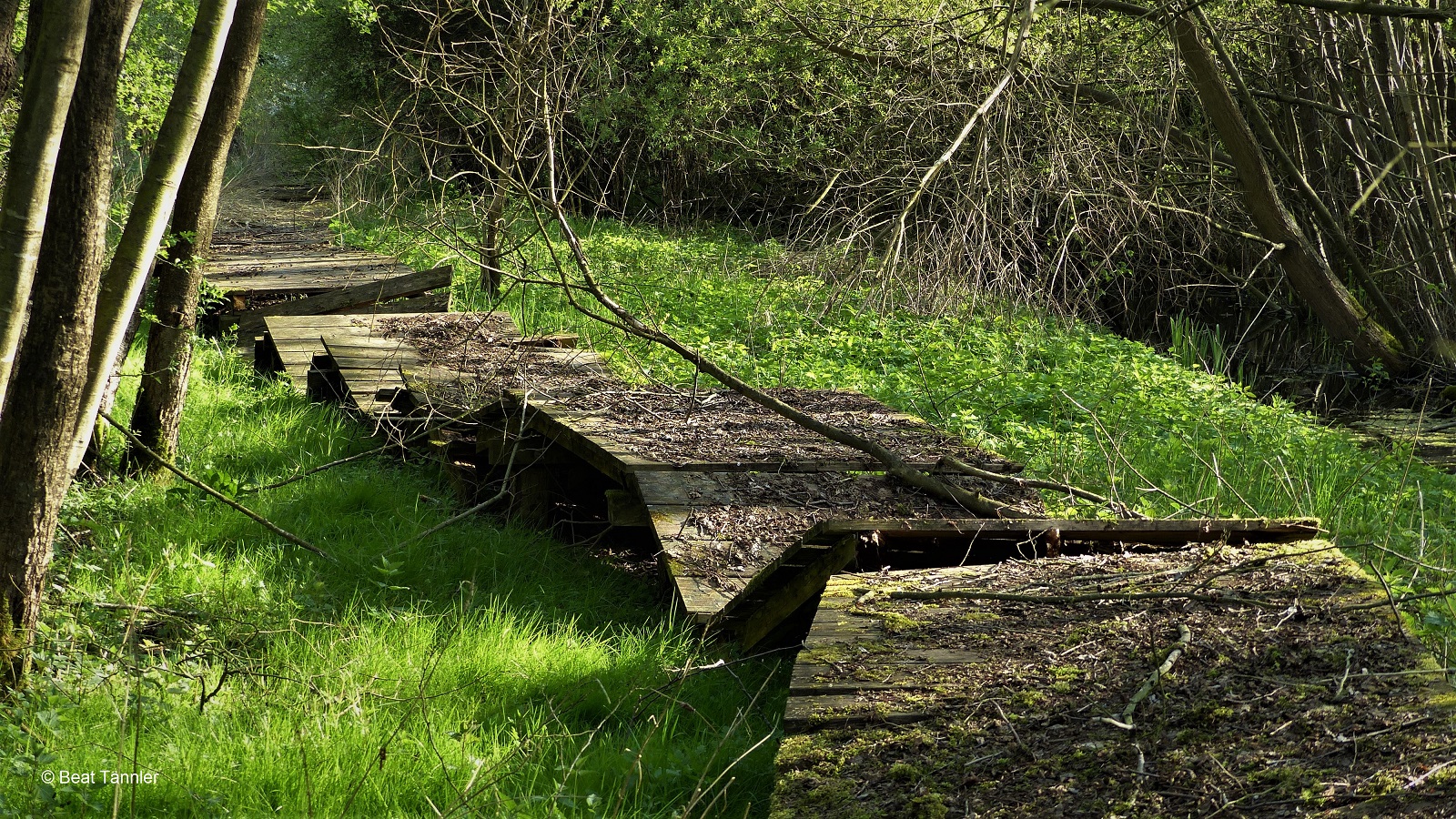 Ein abenteuerlicher Pfad führt hindurch. Dieser hat schon bessere Zeiten gesehen, doch lässt er uns trotz seinem üblen Zustand trockenen Fusses das kleine Feuchtgebiet queren.