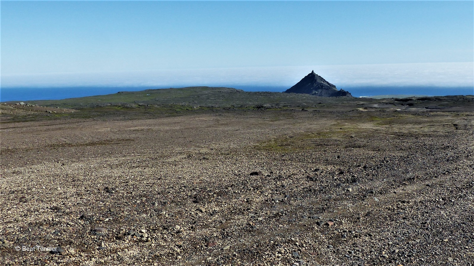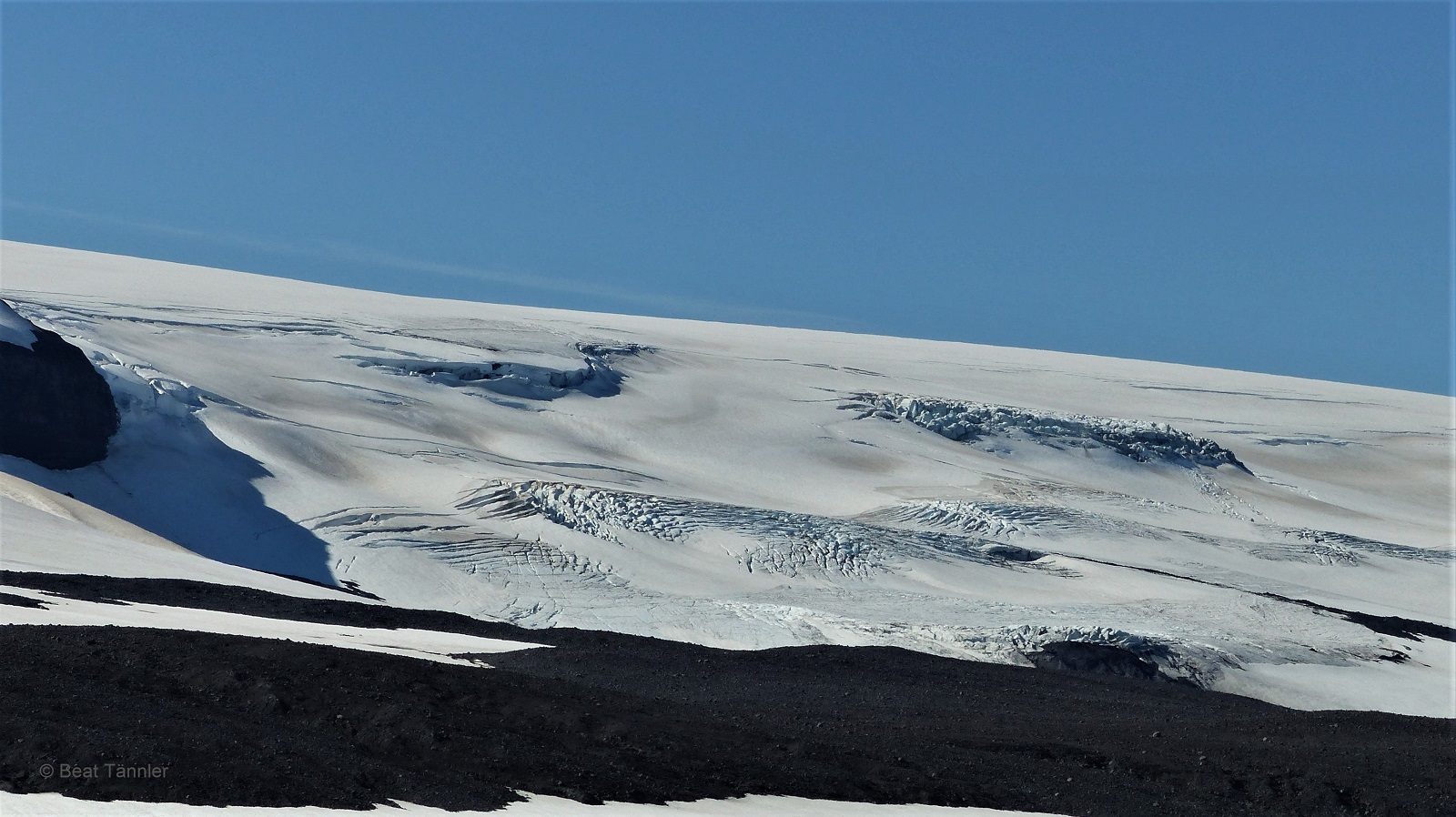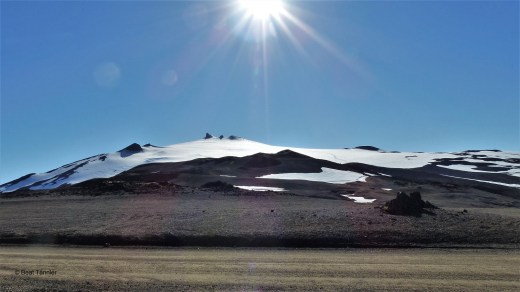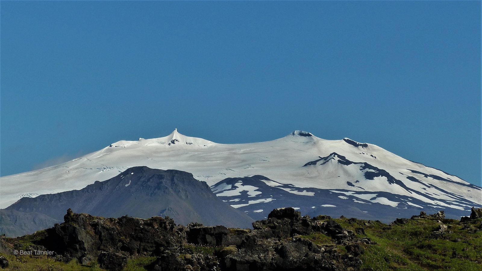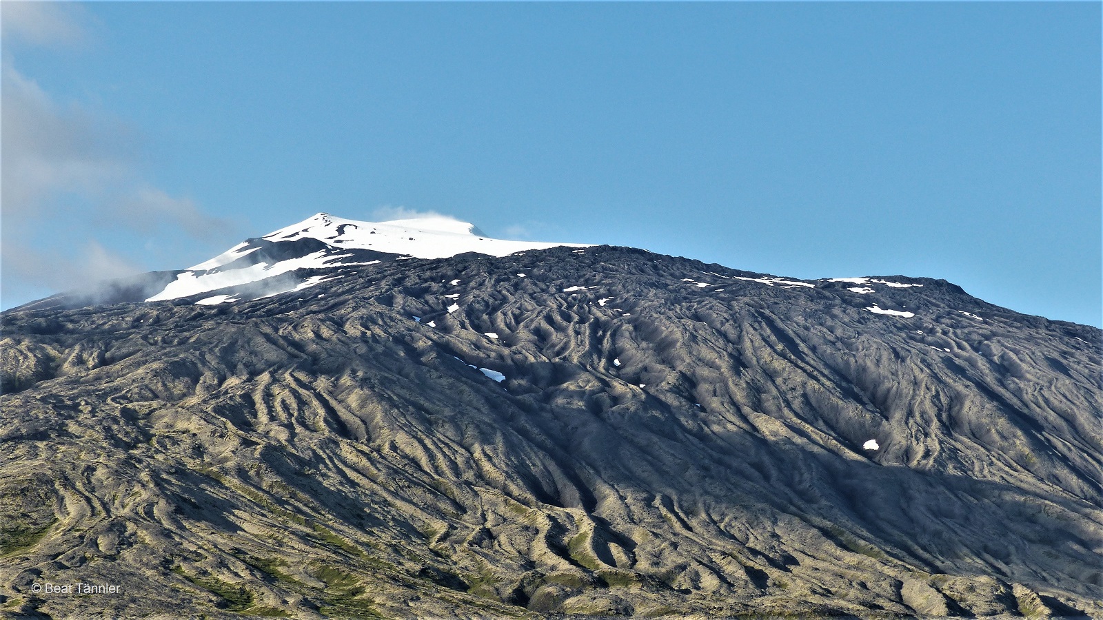 Von Süden her sieht man eindrücklich, dass der Snæfellsjökull ein Vulkan ist. Die erstarrten Lavaströme lassen die Kraft erahnen, die auch heute noch im Erdinnern schlummert.