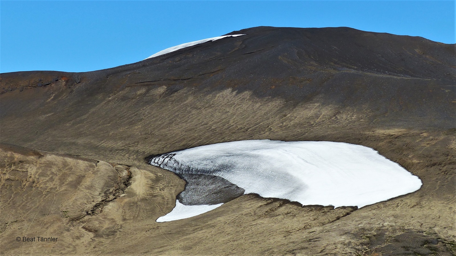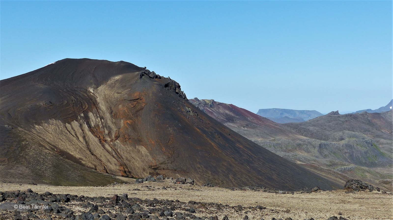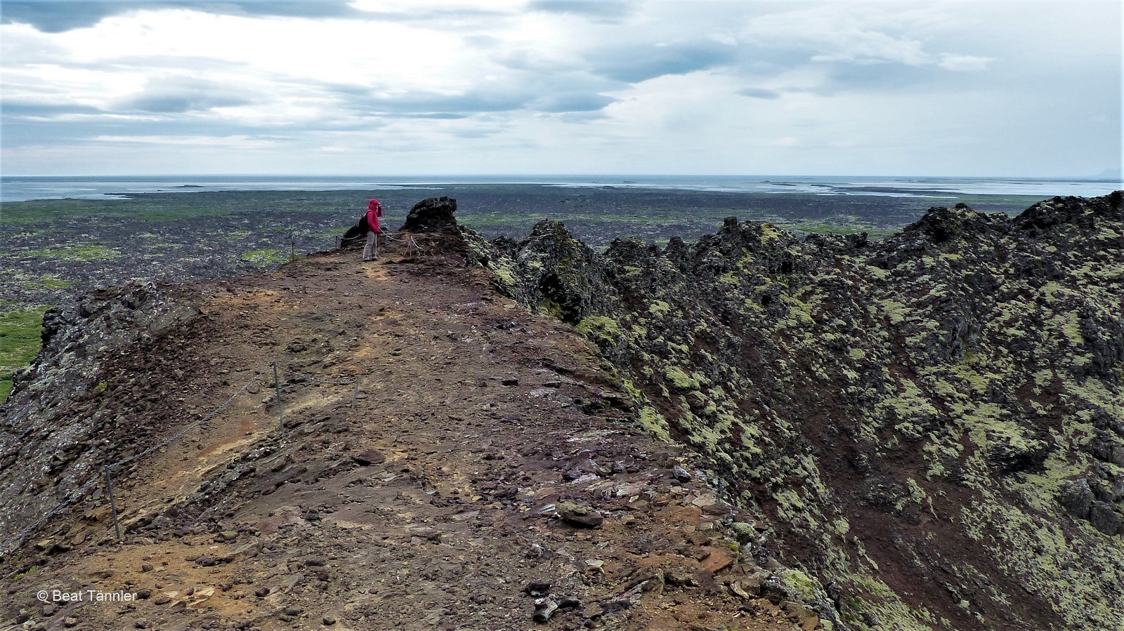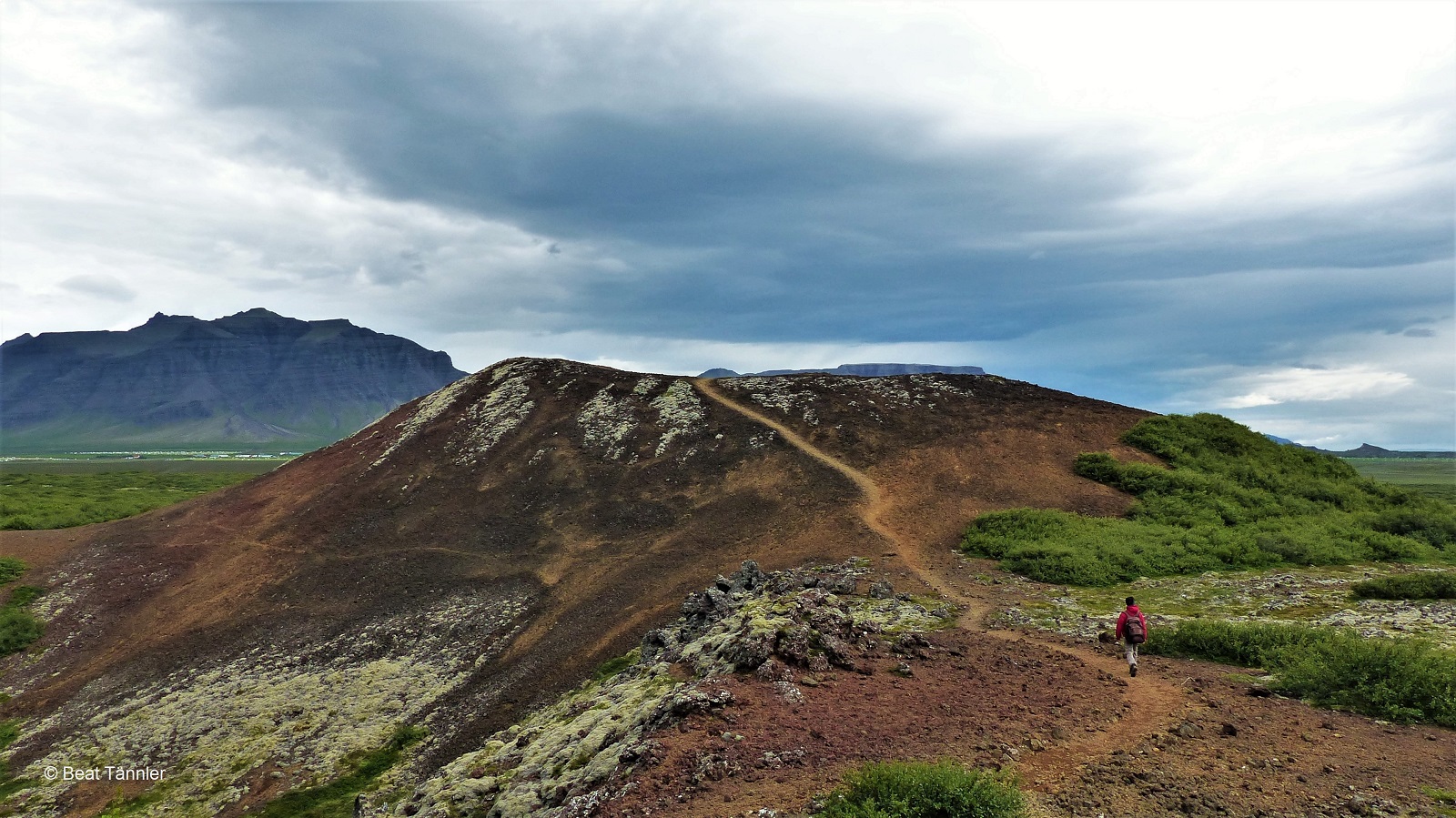 Von Süden her sieht man eindrücklich, dass der Snæfellsjökull ein Vulkan ist. Die erstarrten Lavaströme lassen die Kraft erahnen, die auch heute noch im Erdinnern schlummert.