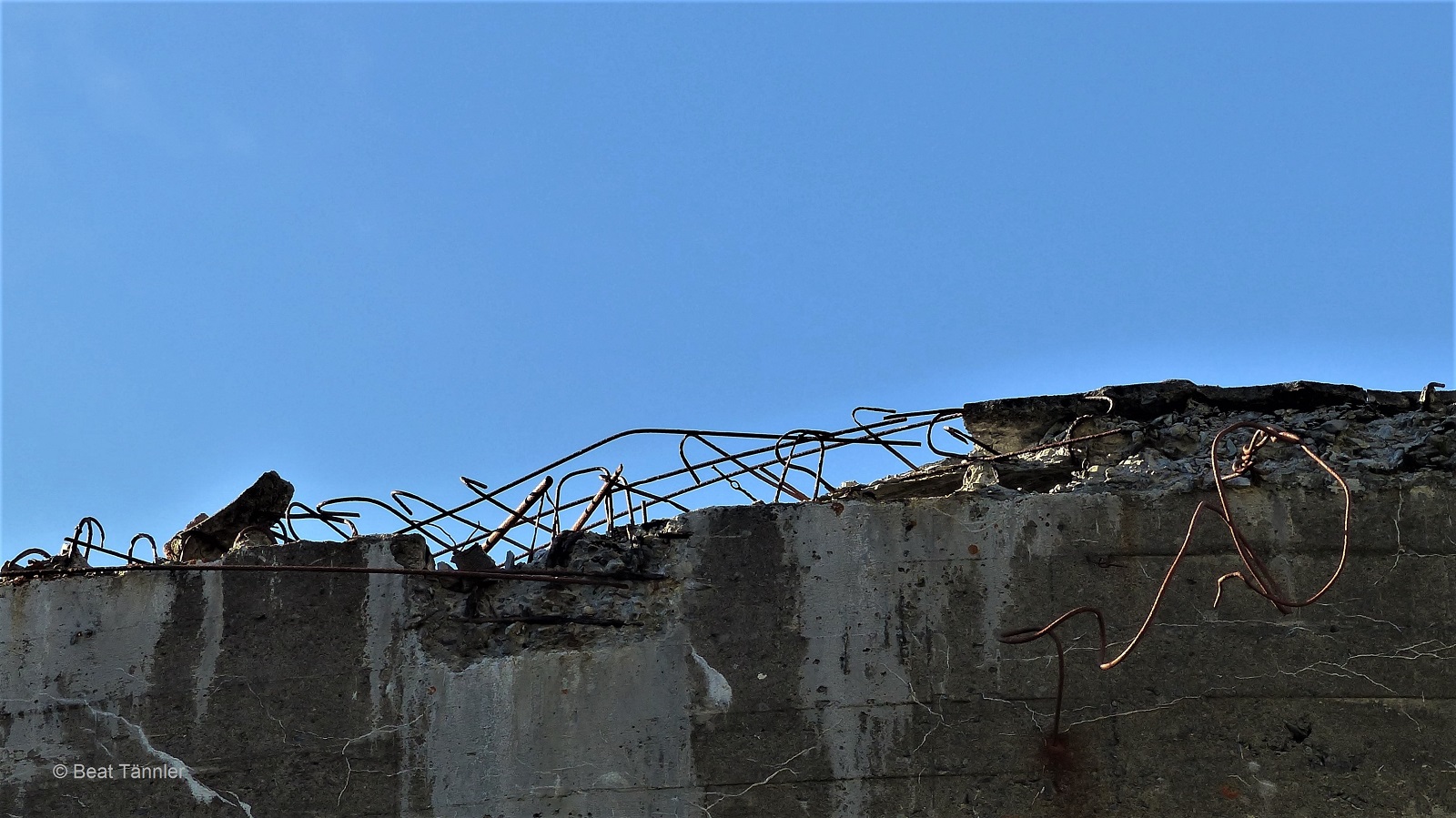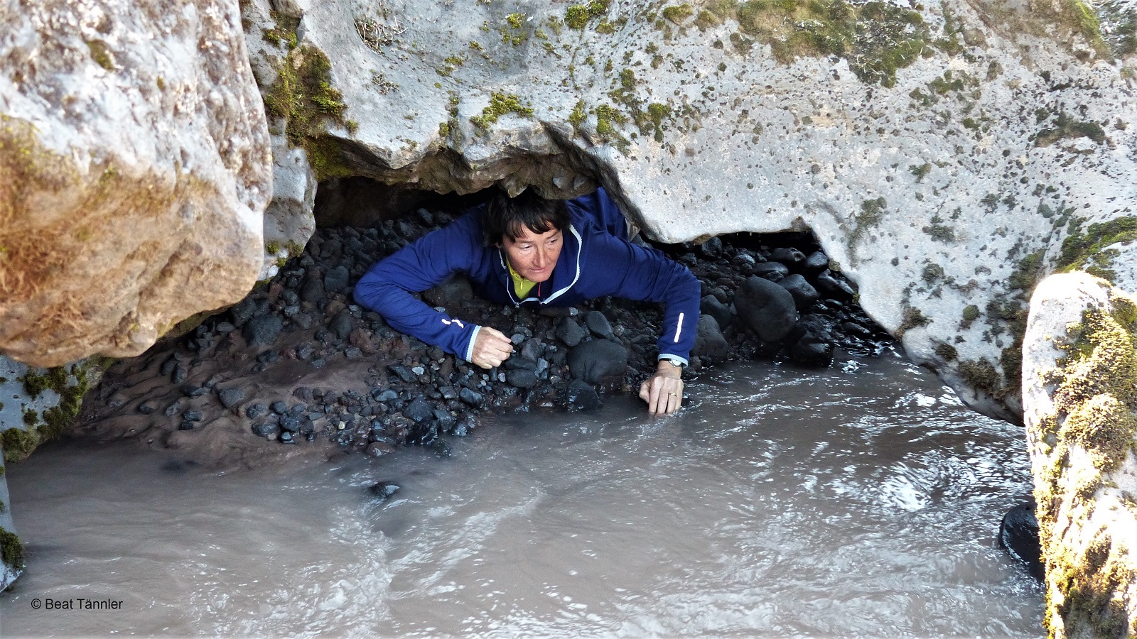 Wir stoppen auf einem riesigen Kiesplatz neben der Strasse und gehen einige Schritte zurück. Weiter bachabwärts kann man ins Tobel hinuntersteigen. Dazu muss man sich aber zuerst am letzten Pfahl des Stacheldrahtzaunes vorbeihangeln, der auf eine vorstehende Felsplatte ca. fünf Meter über der Schlucht geschraubt ist. Aber wir kommen durch … und es lohnt sich!