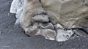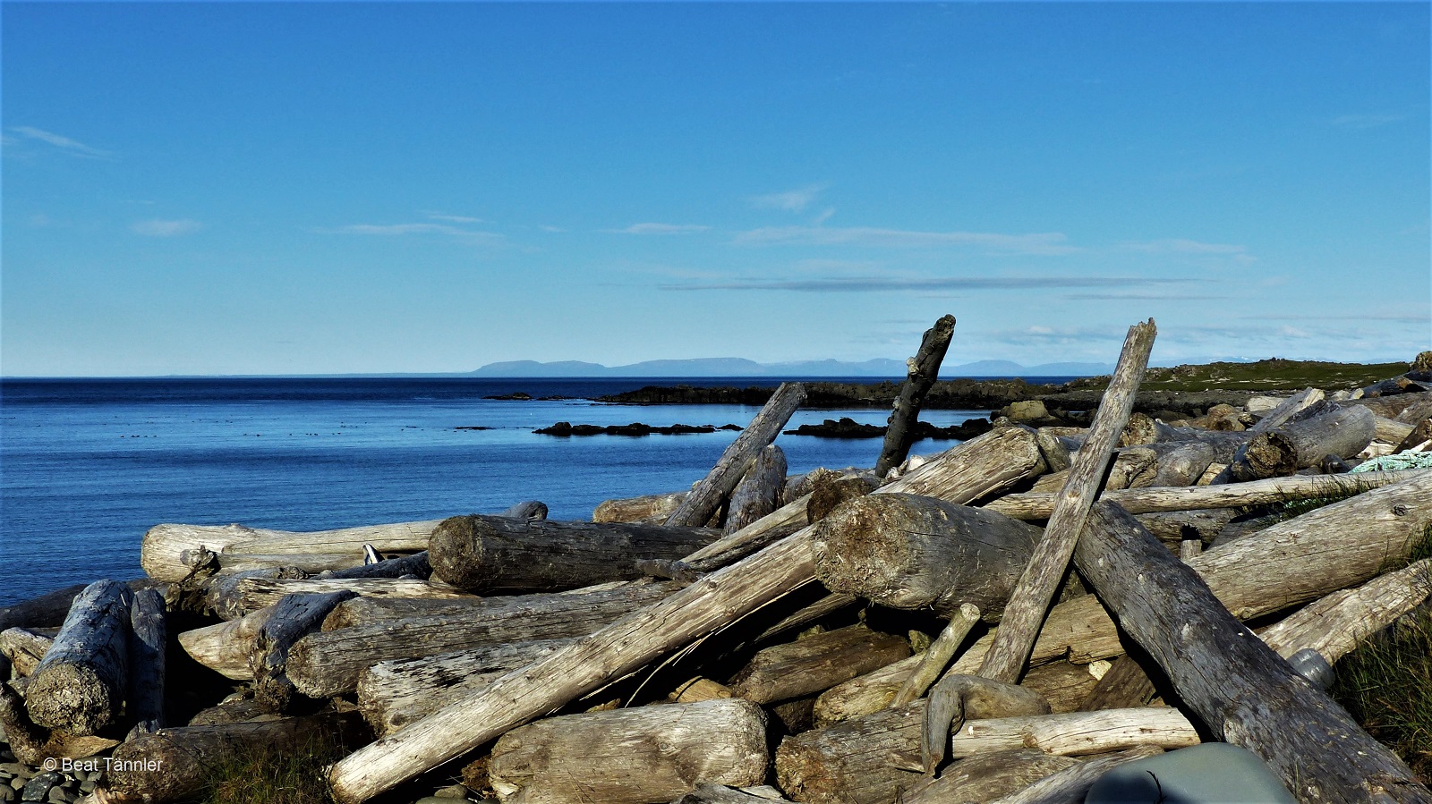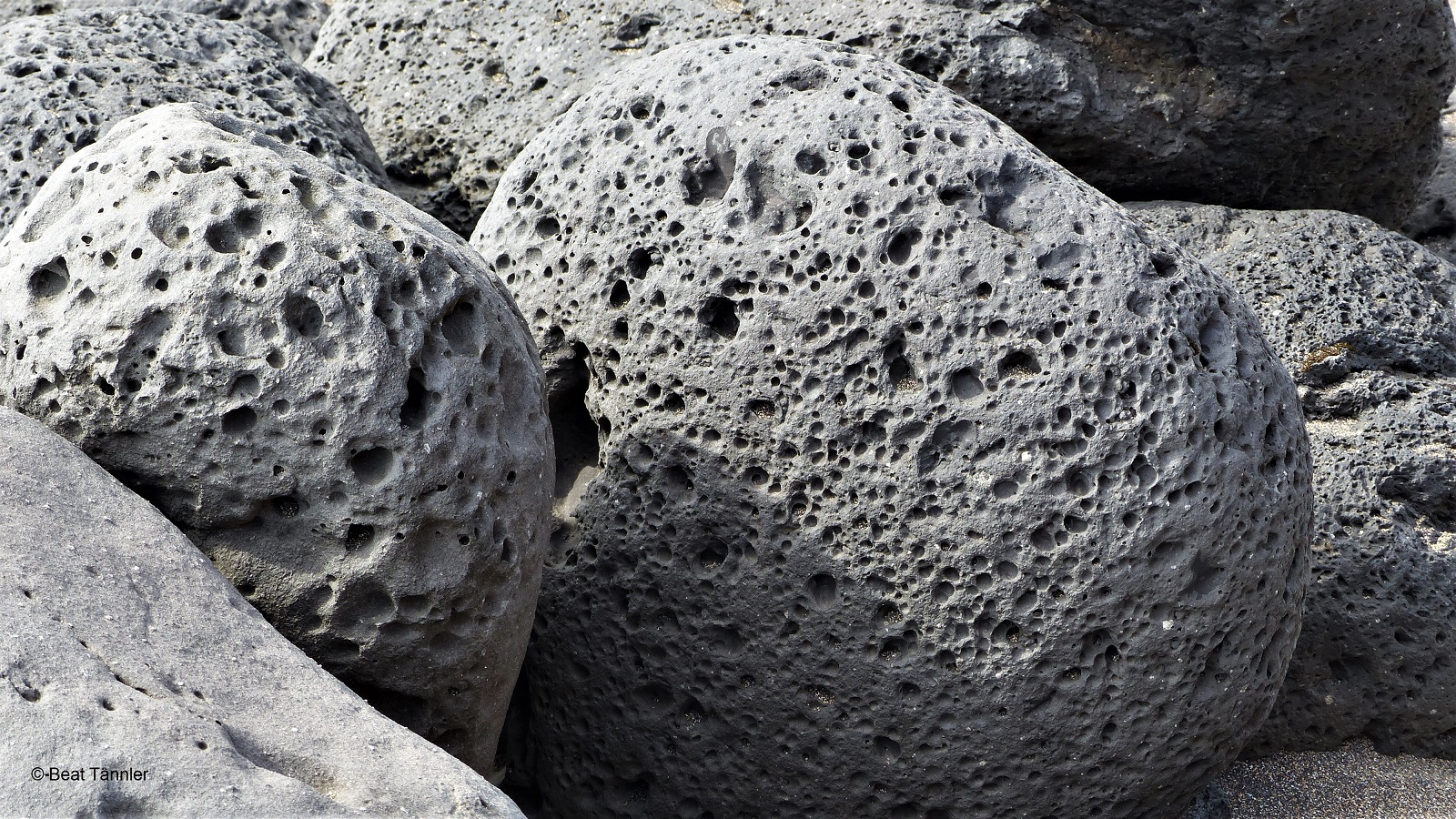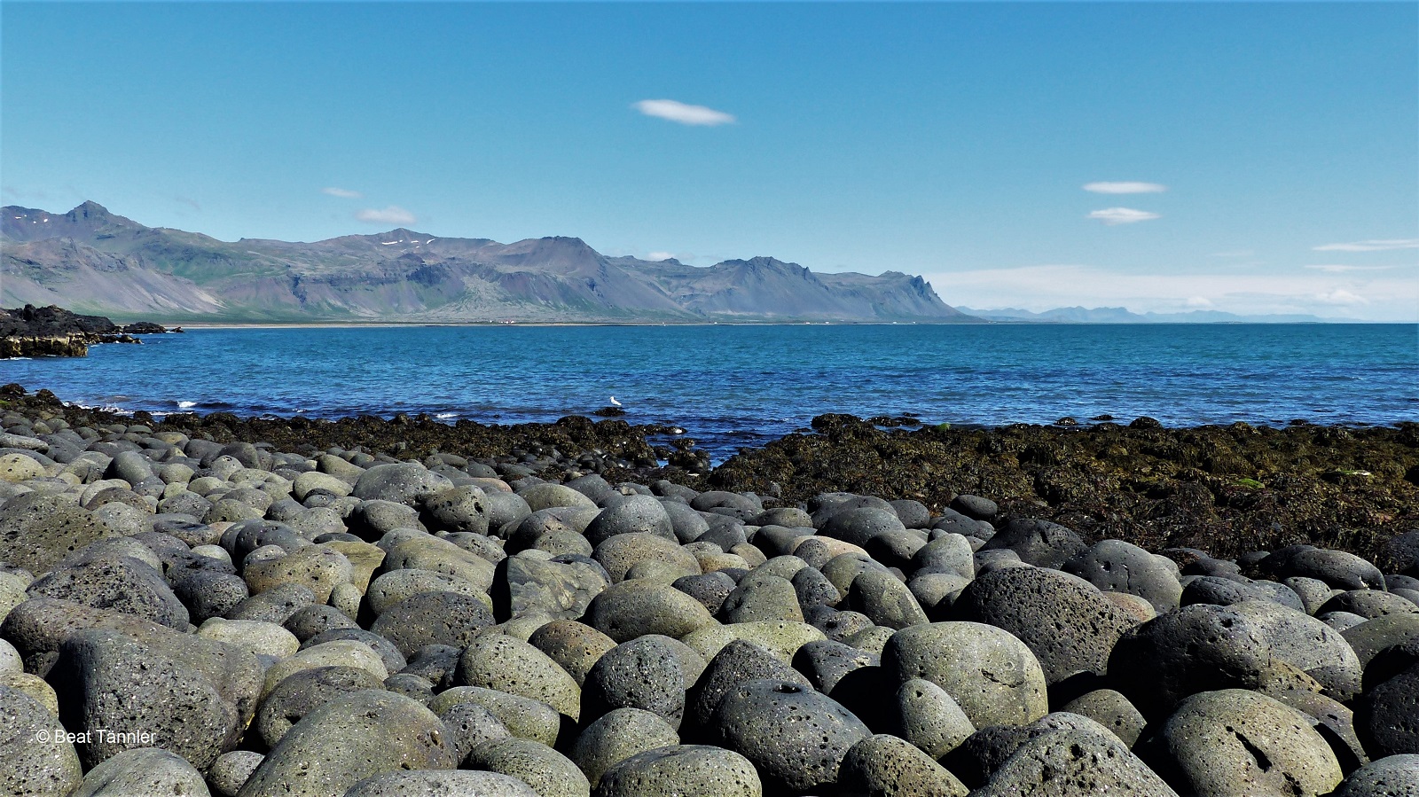 Am Morgen spazieren wir zum nahen Kiesstrand mit den pechschwarzen Steinen.