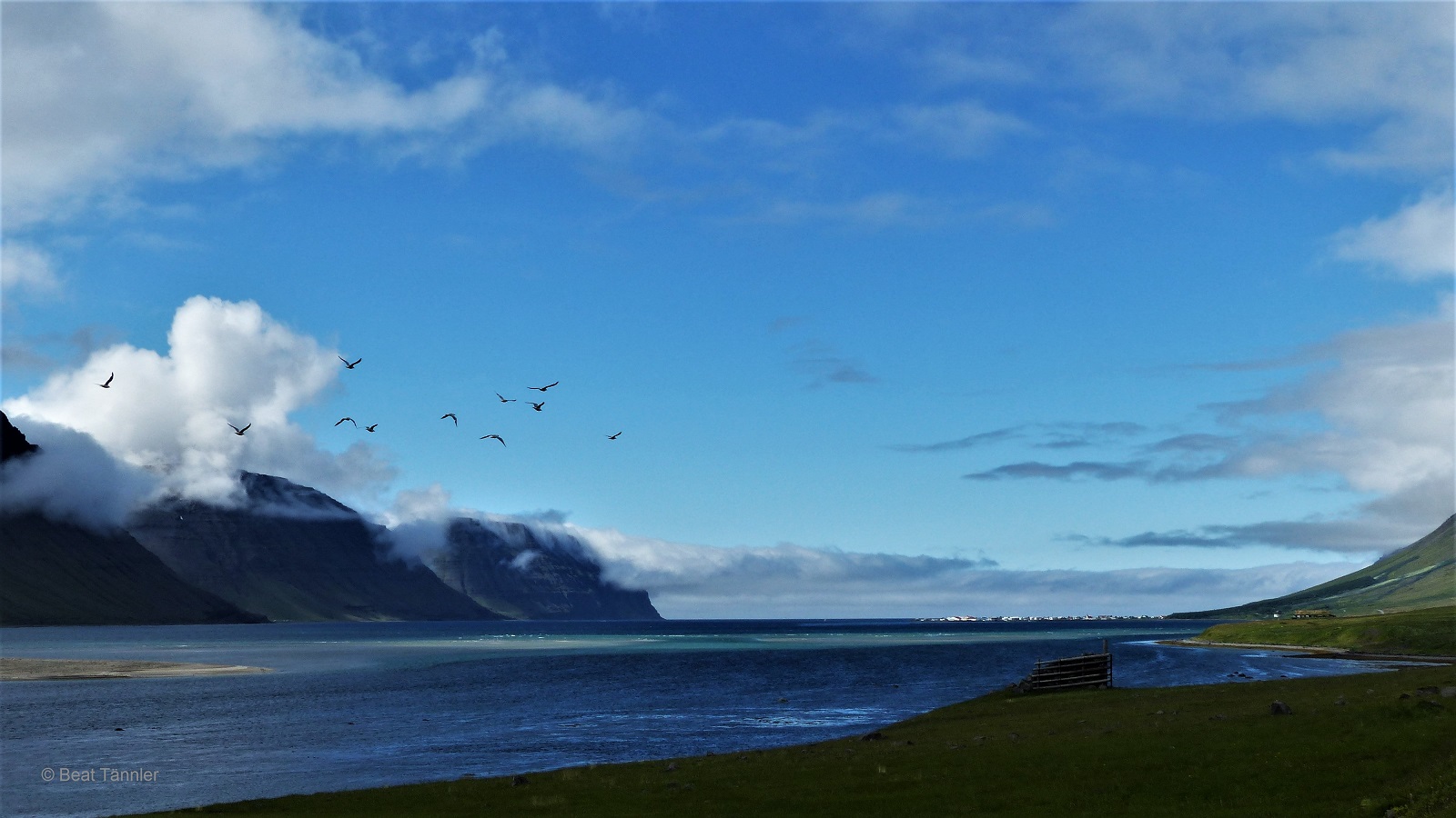 Wir stapfen durch das Moor zum Fjord hinunter, aber ausser nassen Füssen bringt das nicht viel. Die Schwäne sind zu weit draussen.