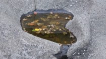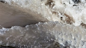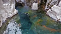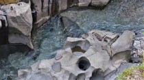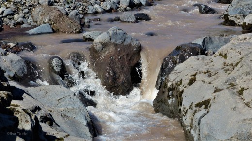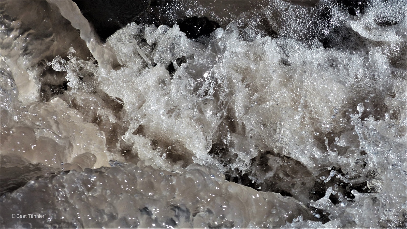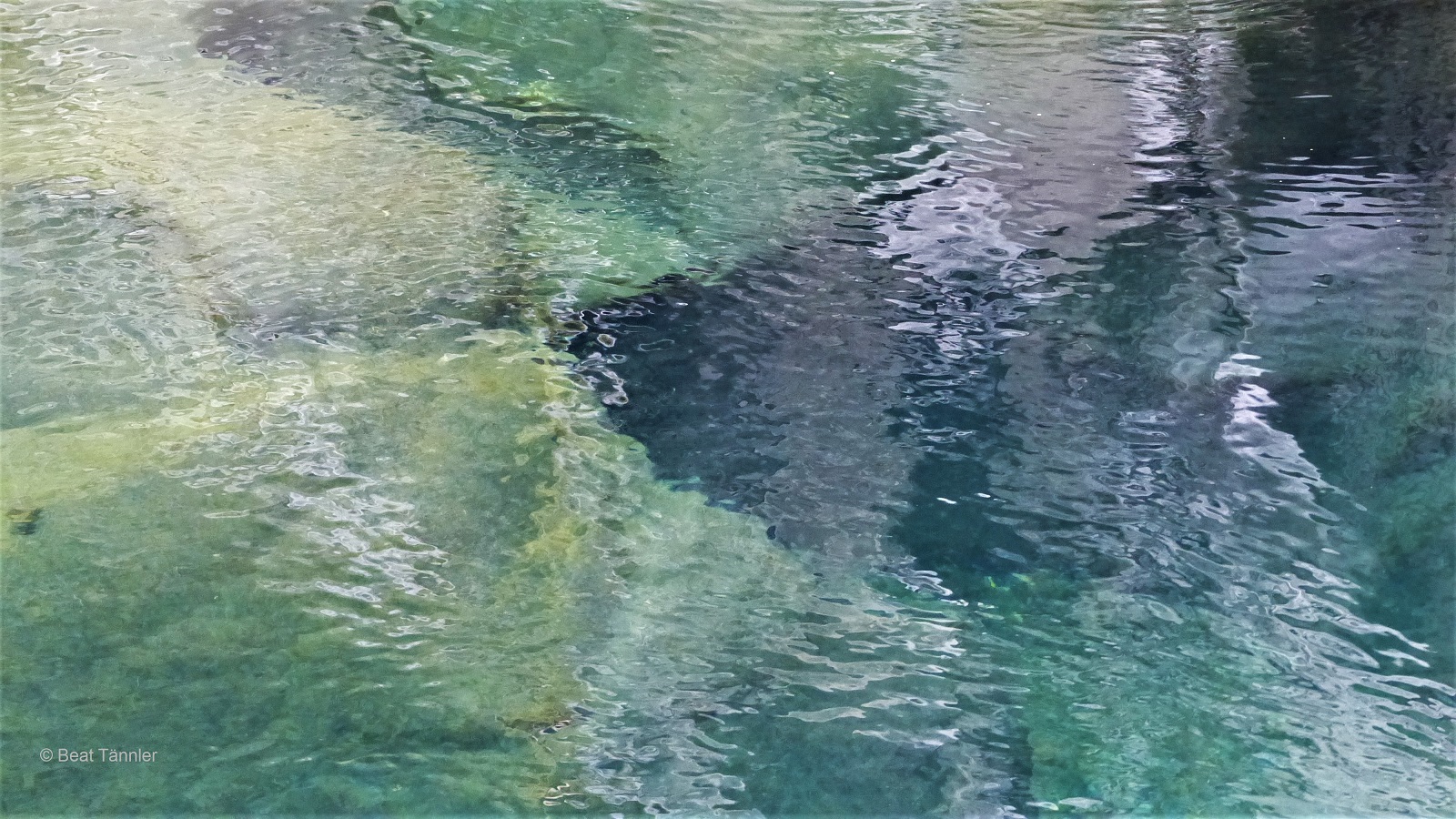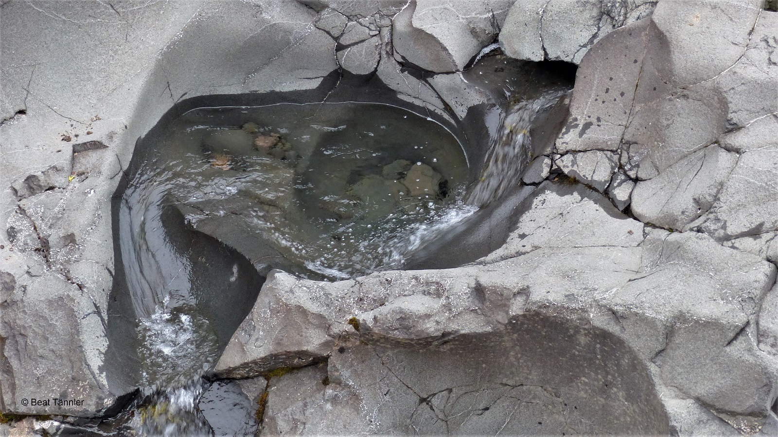 Der Bach hat die verschiedensten Muster in die grauen Felsen geschliffen und unter Wasser sorgen Algen für dezente Farben.
