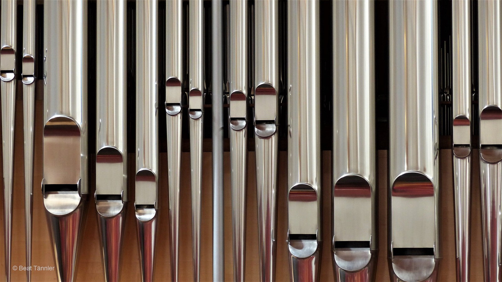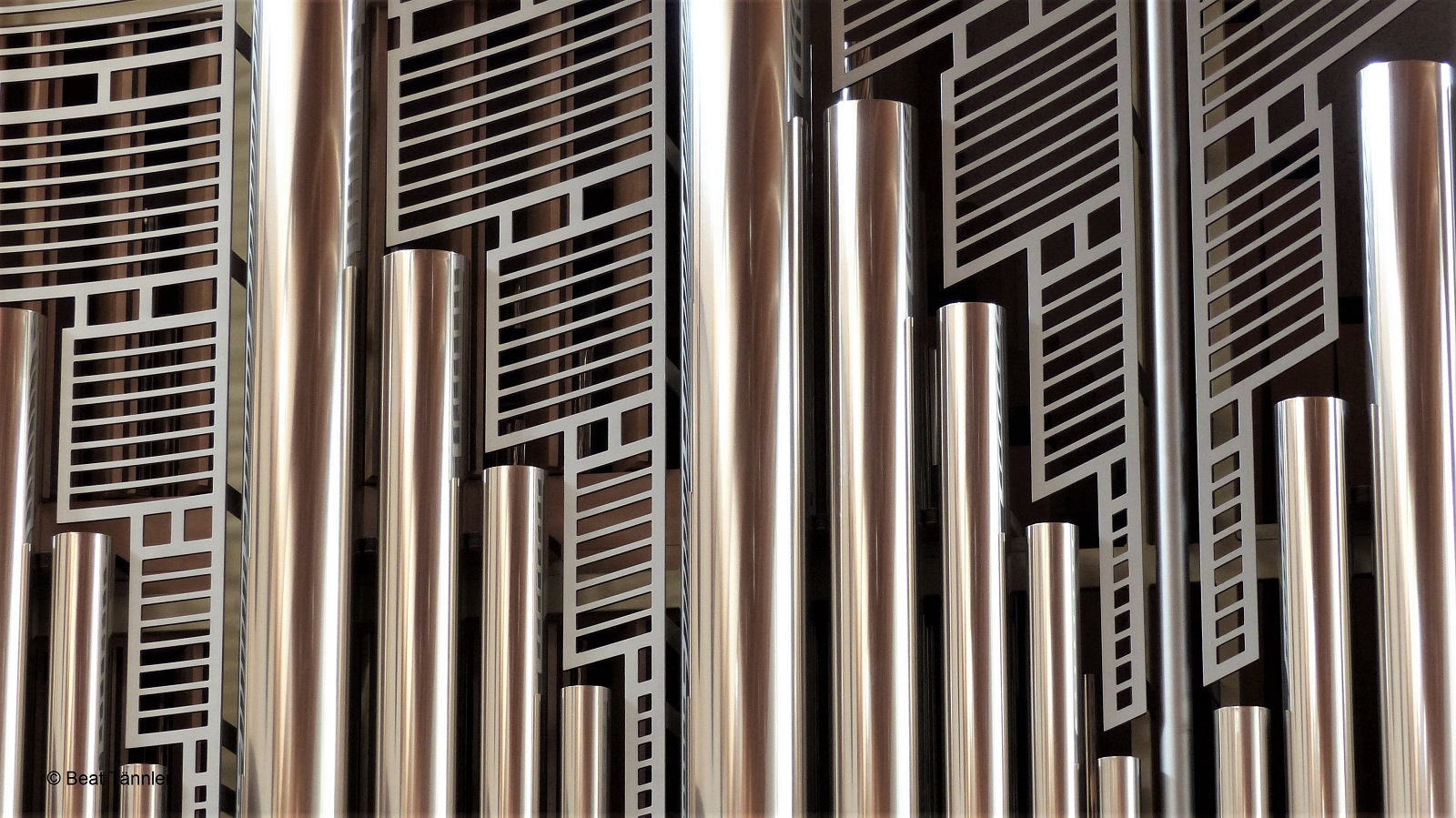 Die Pfeifen der Kirchenorgel sind dekorativ angeordnet und glänzen wunderschön.