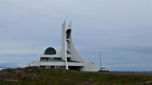 Die futuristische Kirche von Stykkishólmur steht unübersehbar auf einem Hügel. Sie wurde vom Architekten Jón Haraldsson entworfen und im Jahre 1990 eingeweiht.