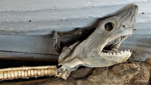 Das Haifischmuseum ist ein vollgestellter Raum auf einem Bauernhof. Von antiken Nähmaschinen und Angelgeräten über ausgestopfte Vögel und Haigebisse bis zu einem alten Boot wird hier alles mögliche ausgestellt.