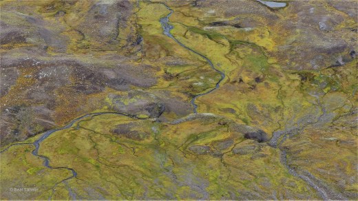 Unter uns liegt ein weiteres natürliches Kunstwerk. Eine karge, felsige Ebene, auf der sich lediglich Moose und Flechten behaupten können, wird von einem Rinnsal durchzogen.