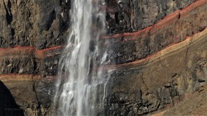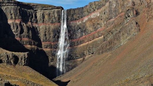 Wir sind etwas spät dran, deshalb marschieren wir sehr zügig zum Hengifoss hinauf. Zum Glück erreichen wir ihn noch kurz bevor der Schatten des Gebirges auf ihn fällt. Wunderschön leuchten die roten Tonstreifen im Fels in der Sonne.