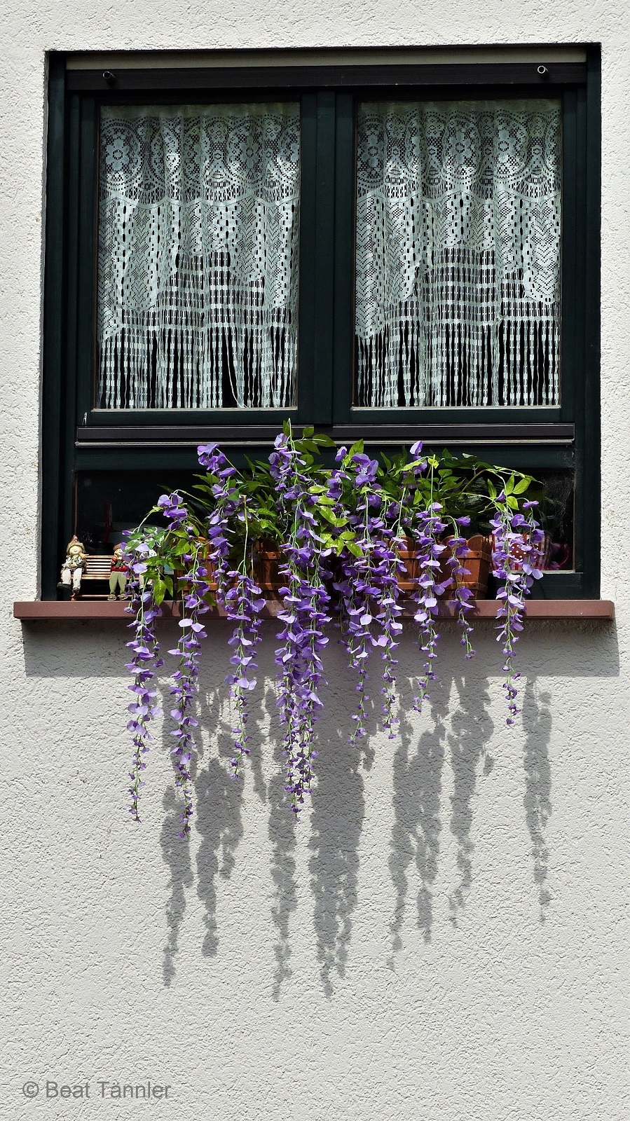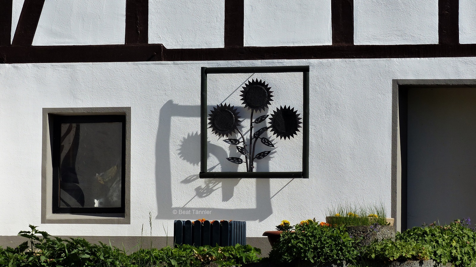 Die Sonne spielt mit den Blumen auf einem Fenstersims und wirft ihre Schatten auf die weisse Hauswand.
