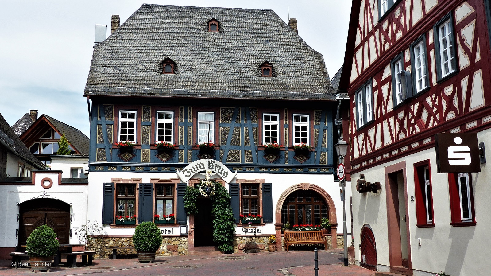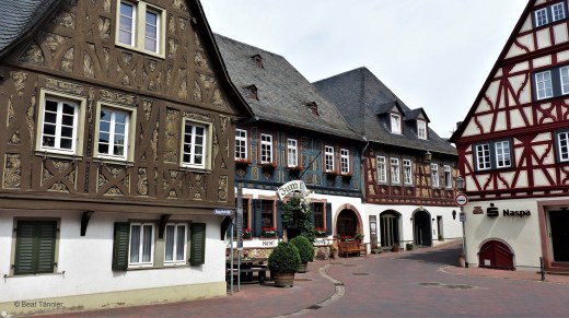 Von der Kisselmühle fahren wir durchs Rheingau ins nahe Hattenheim. Das Dorf besticht mit seinen üppig verzierten Fachwerkbauten.