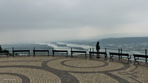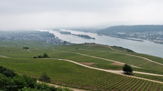 Vom nahen Niederwald Denkmal geniesst man einen wunderschönen Blick über die Rebberge hinunter zum Rhein. Leider hängen die Wolken heute Vormittag noch tief.