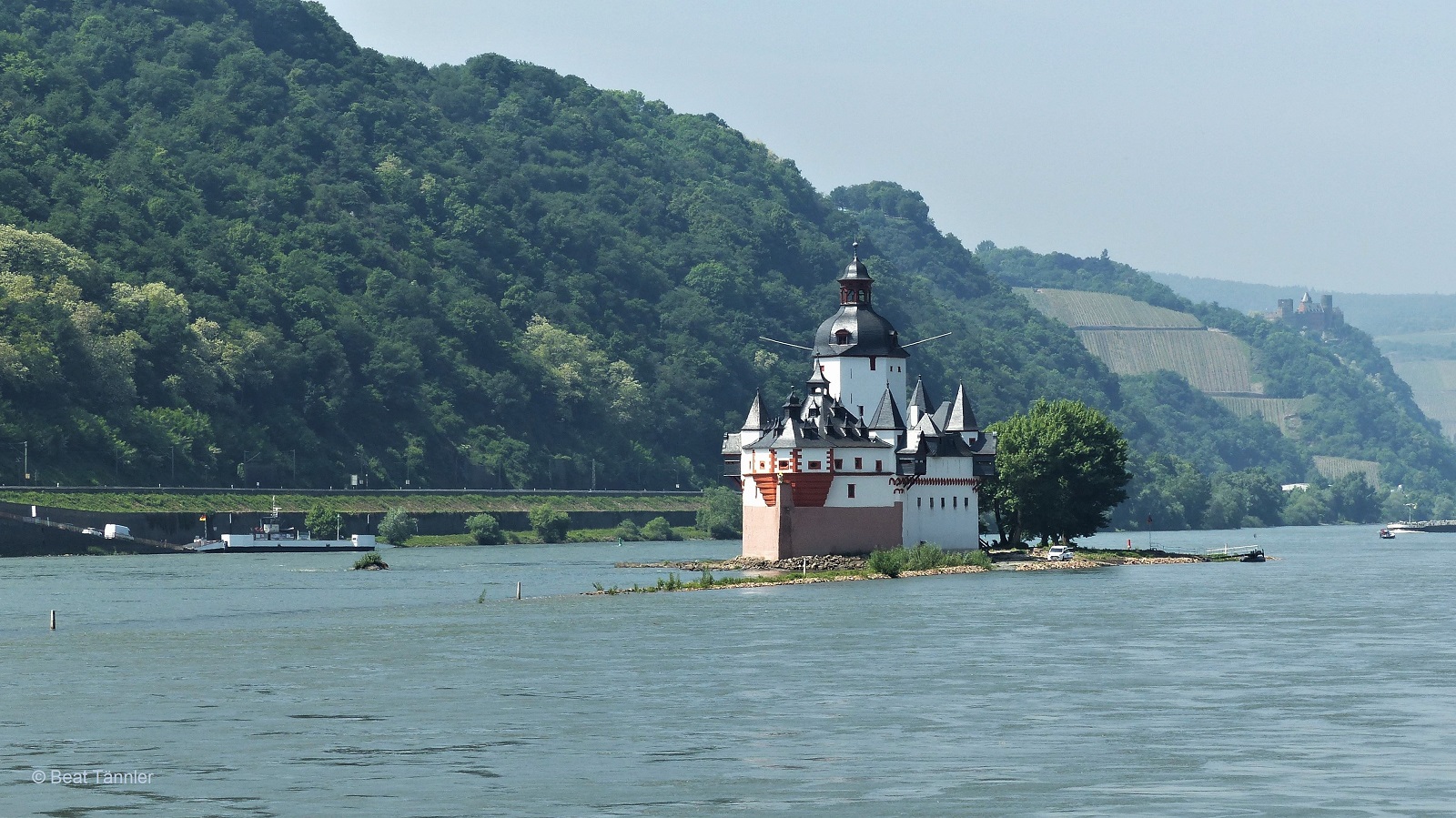 Wie ein Schiff, das rheinaufwärts fährt, steht die Burg Pfalzgrafenstein mitten im Fluss.