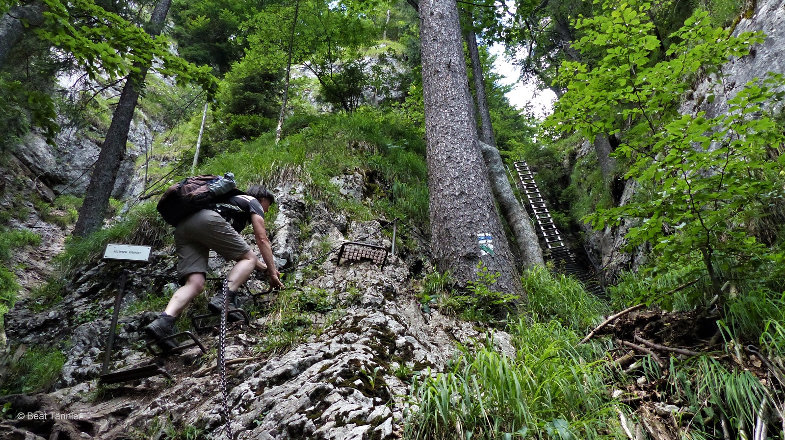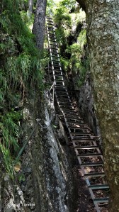 Der Weg führt über mehrere in den Felsen eingelassene Eisenbügel und Gitter und hohe Leitern.