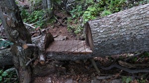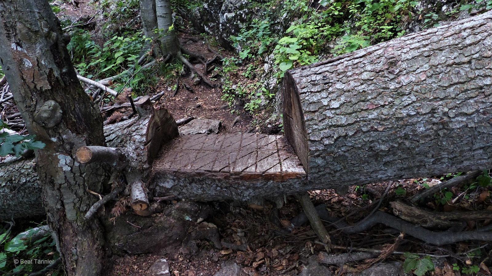 … oder eine umgestürzte Tanne originell zur „Baumschwelle“ ausgesägt. Selbst die Rillen für den besseren Halt wurden liebevoll eingefräst.