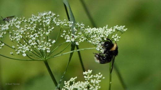 Eine Hummel saugt fleissig Nektar aus den Blüten eines Kerbels.