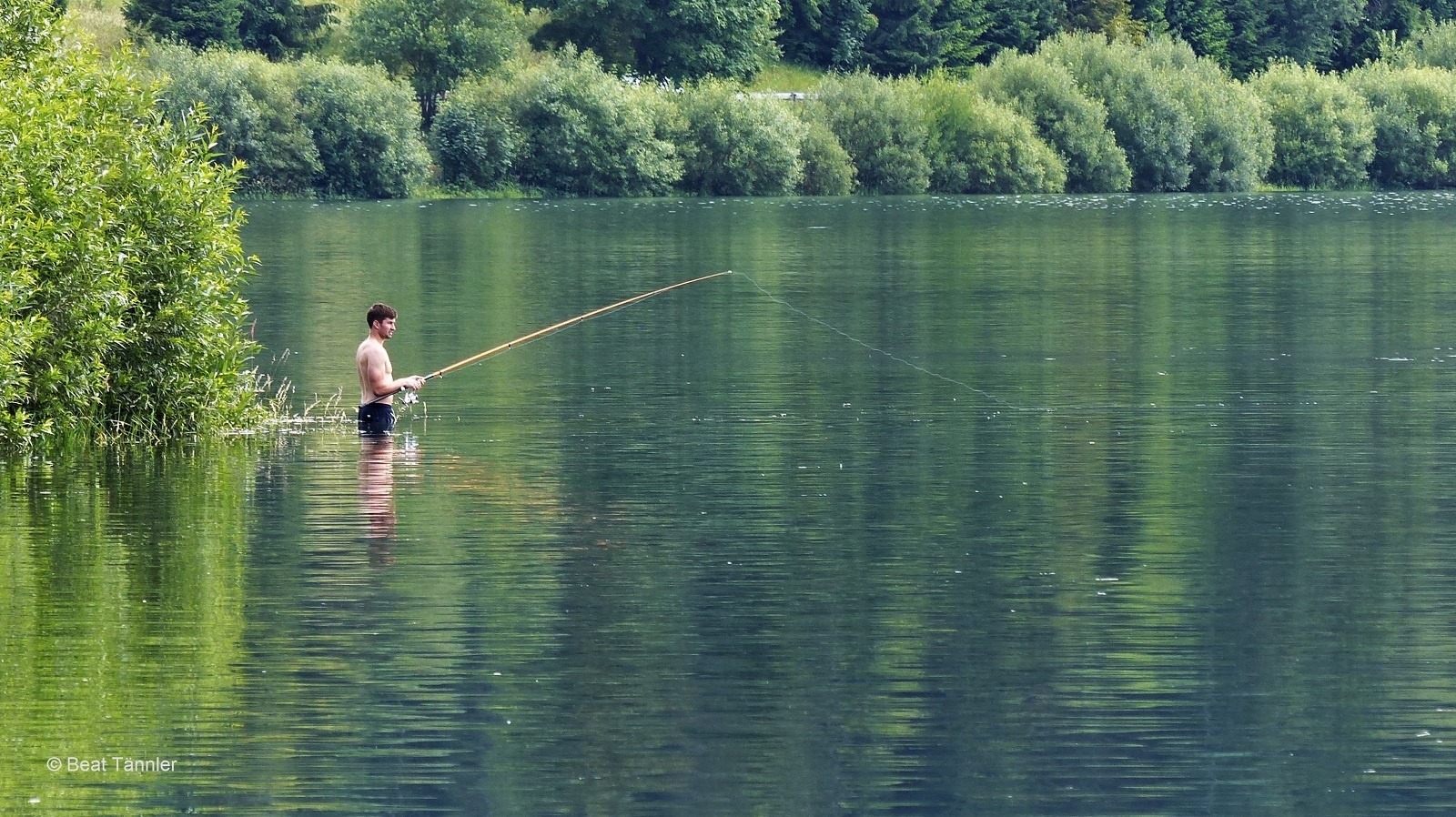 Ein einsamer Fischer steht im See und versucht Beute an seine Angel zu locken.