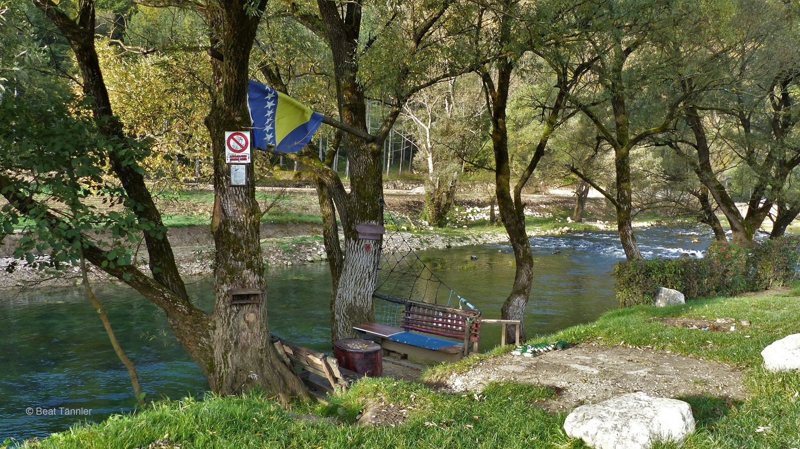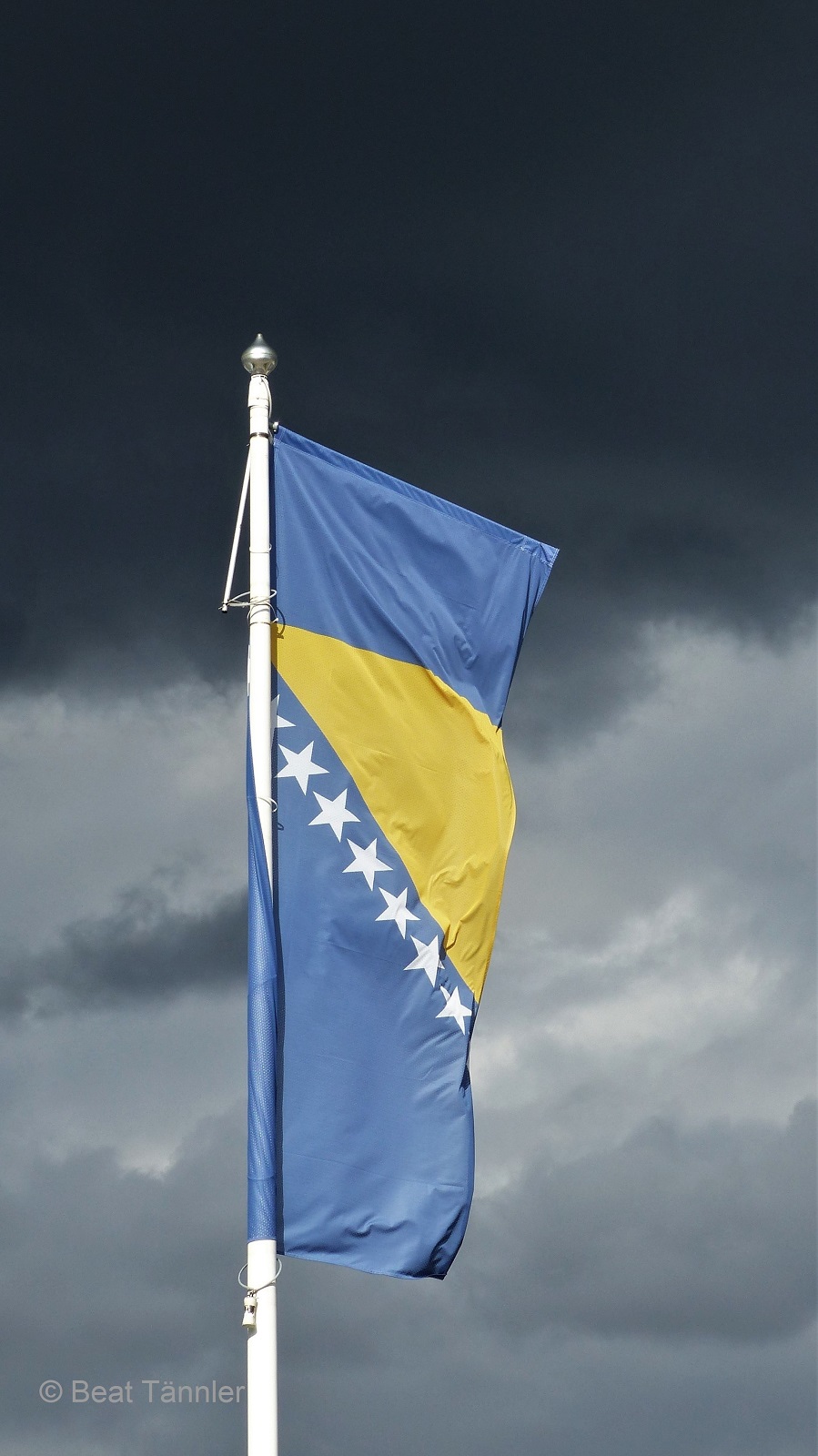 In Bosanski Petrovac kaufen wir ein. Auf dem Parkplatz weht die Fahne von Bosnien und Herzegowina. Auch wenn sie im Lichte strahlt, ist doch der düstere Hintergrund und dass sie verdreht am Mast hängt Sinnbild für die politische Lage in diesem noch jungen Staat.