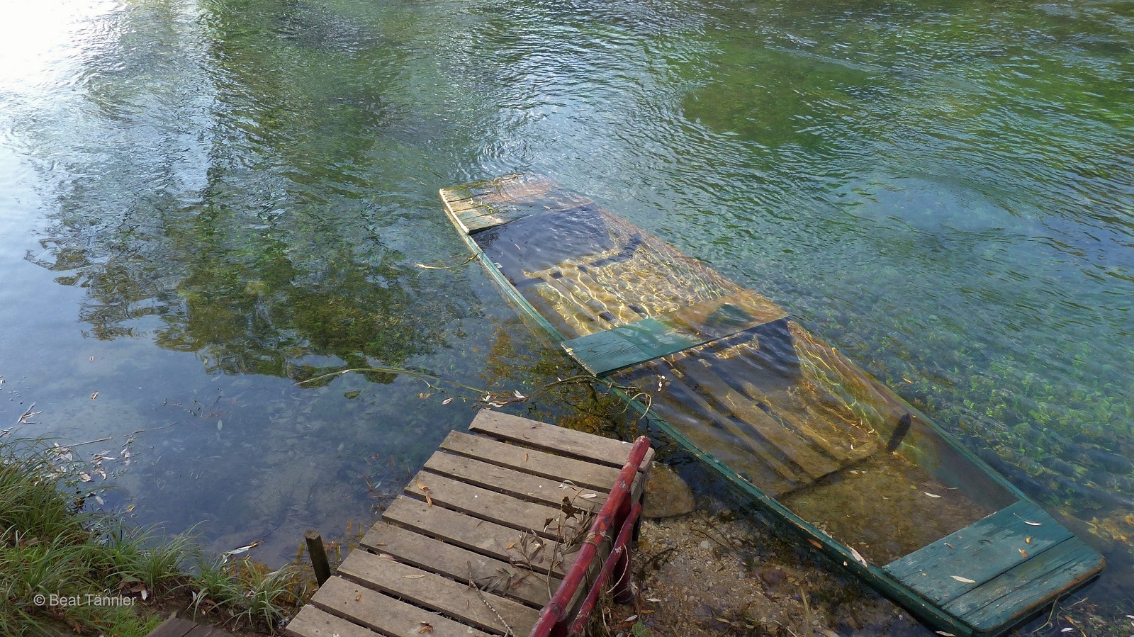 Erstaunt beobachten wir einen Mann, der seinen Weidling mit einer Schneeschaufel statt mit Ruder oder Stangen über den Fluss und zurück bewegt. Dabei schaut er angestrengt ins Wasser, als ob er etwas suchen würde.