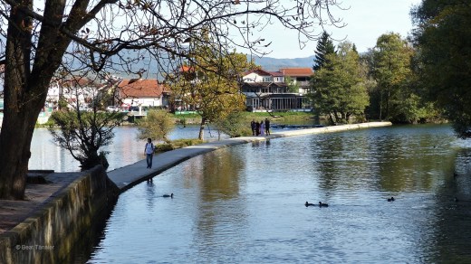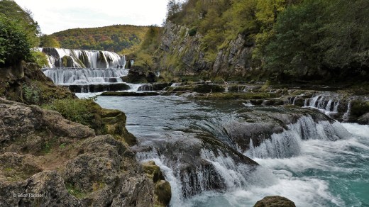 Das Dorf Martin Brod wird durch den Fluss Una zweigeteilt. Wir überqueren die schmale Brücke und bestaunen von oben die faszinierenden Sinterbecken.