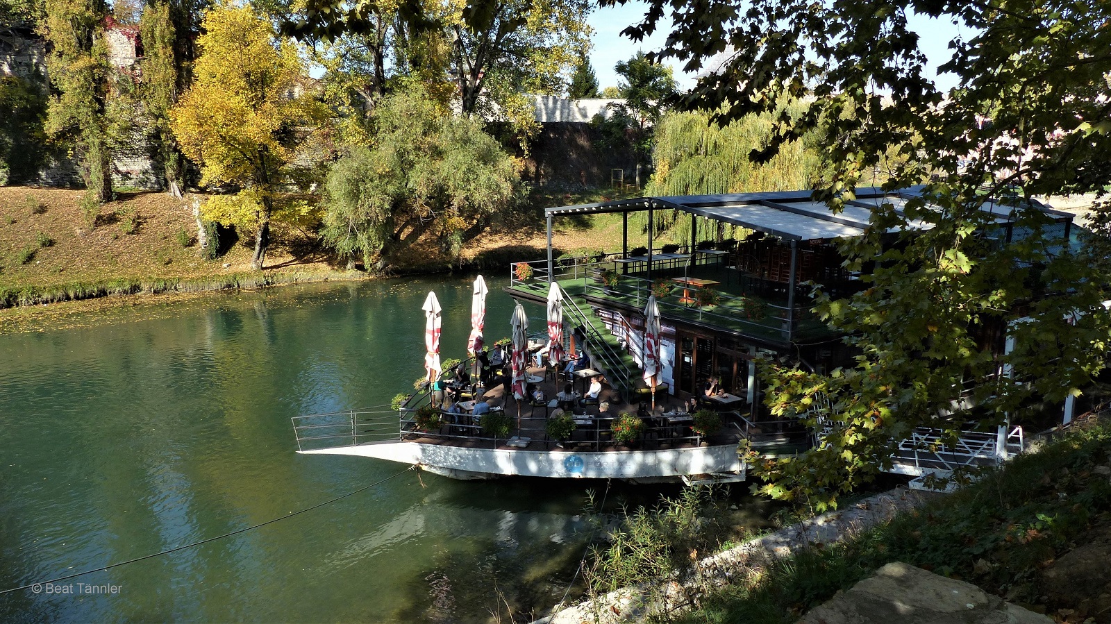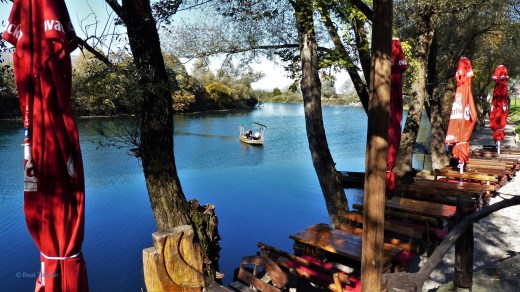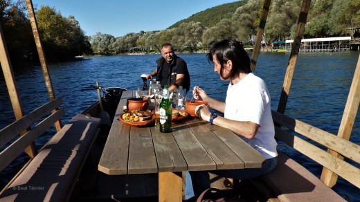 Der Parkwächter Alen hat uns gestern erzählt, dass das Restaurant River Dock in Ripać Mahlzeiten auf einem Boot anbiete.