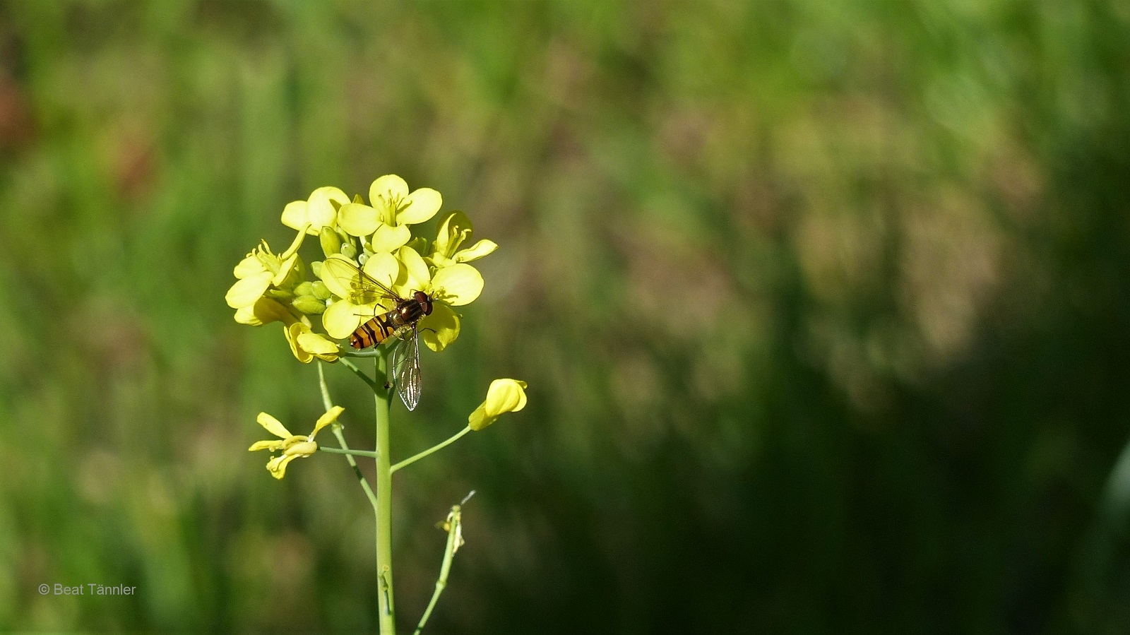 Am Wegesrand ruht sich eine Schwebfliege auf einer Senfblüte aus.