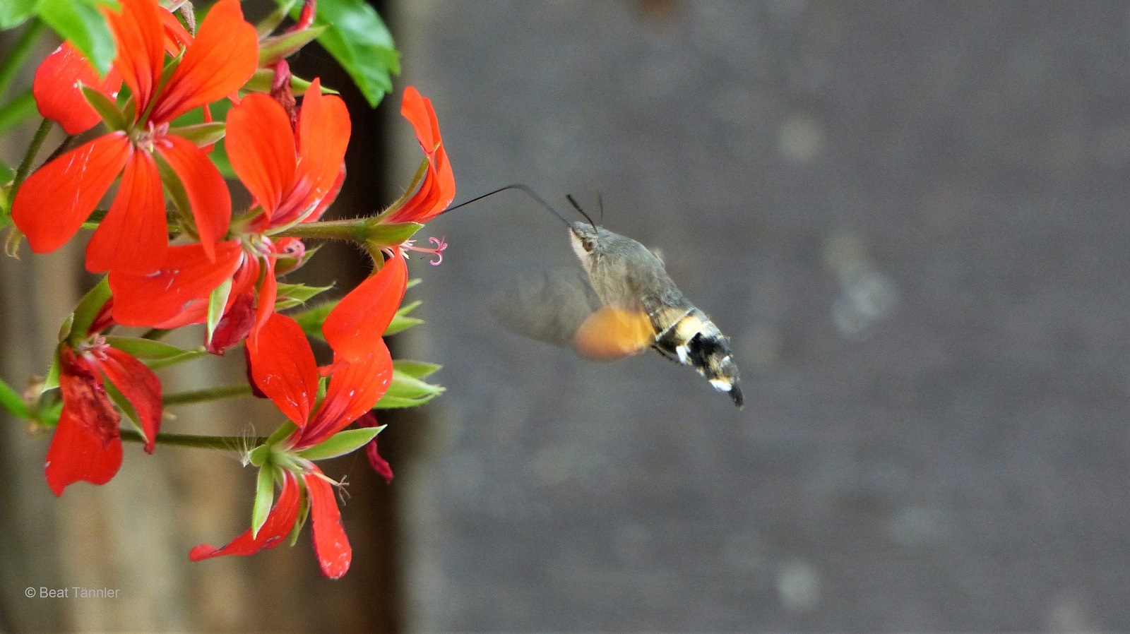 Der Taubenschwanz ist das einzige Insekt, das wir je an einer Geranienblüte gesehen haben.