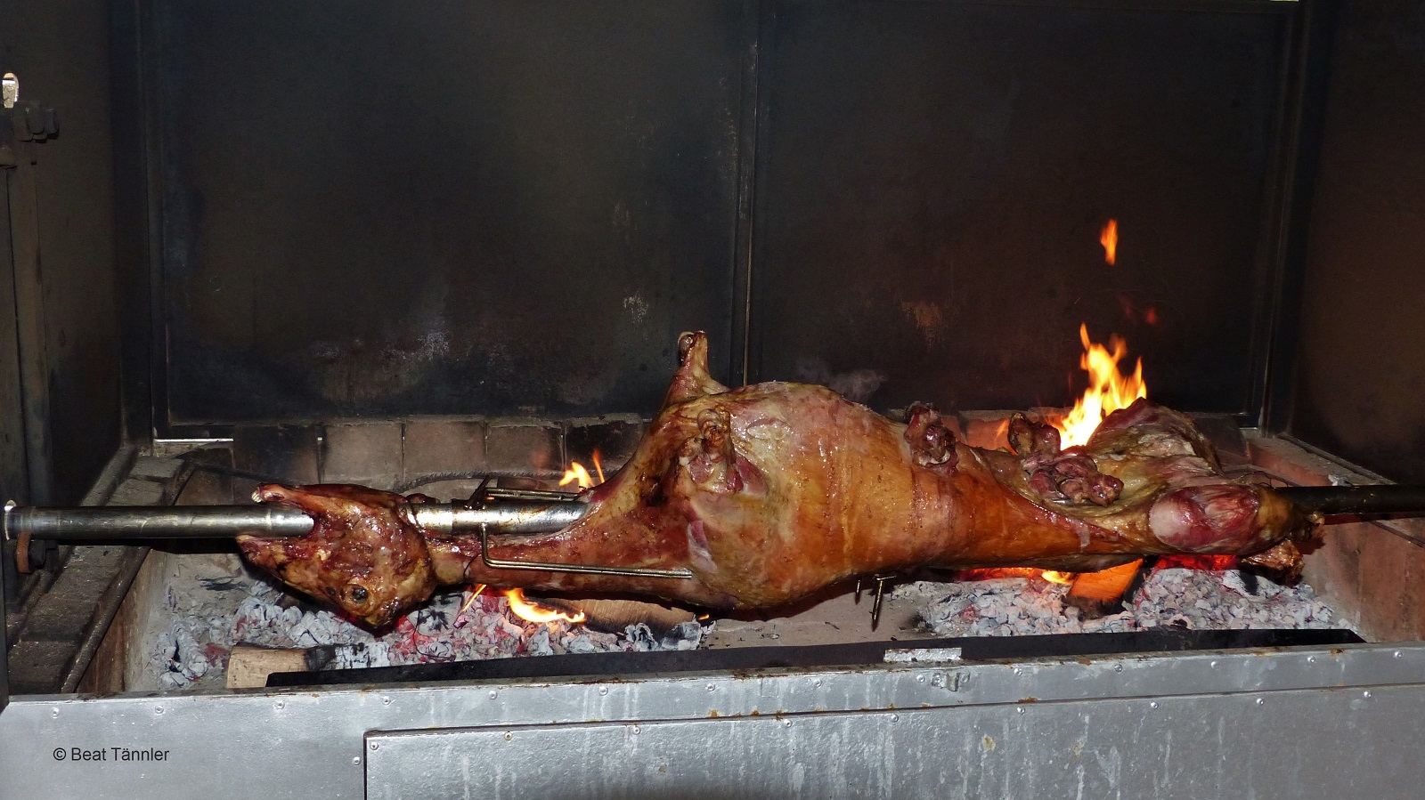 Der Braten nimmt langsam Farbe an. Auch wenn das Bild wohl einigen unsere LeserInnen eher den Appetit verschlägt als anregt, wollen wir es hier zeigen.