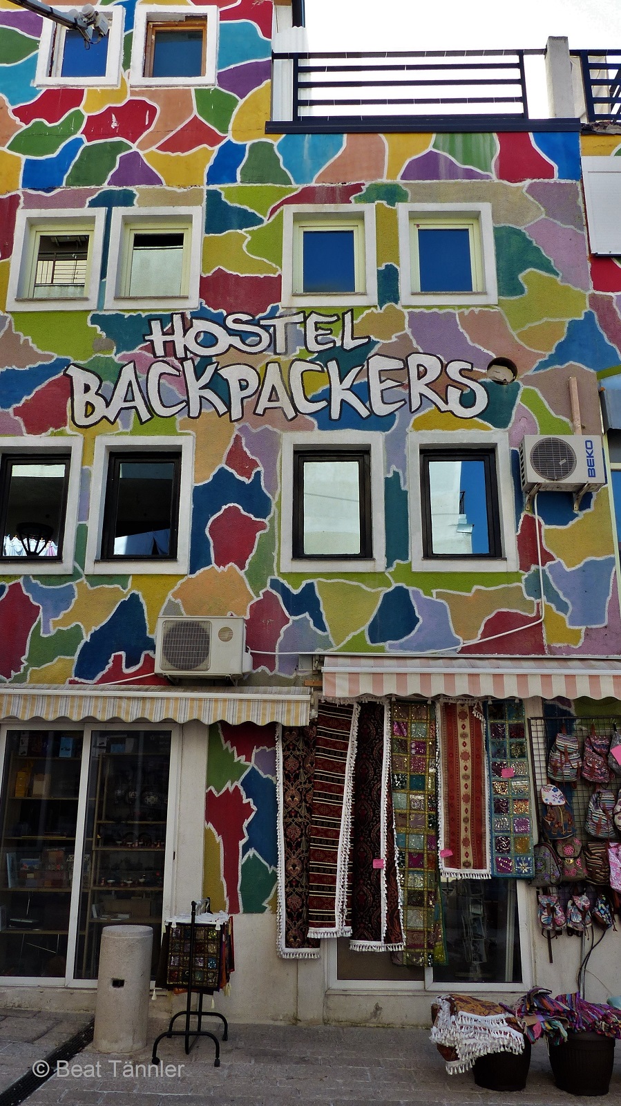 Weniger kunstvoll, aber dafür sehr bunt, präsentiert sich an bester Lage in der Altstadt das Hostel Backpackers.