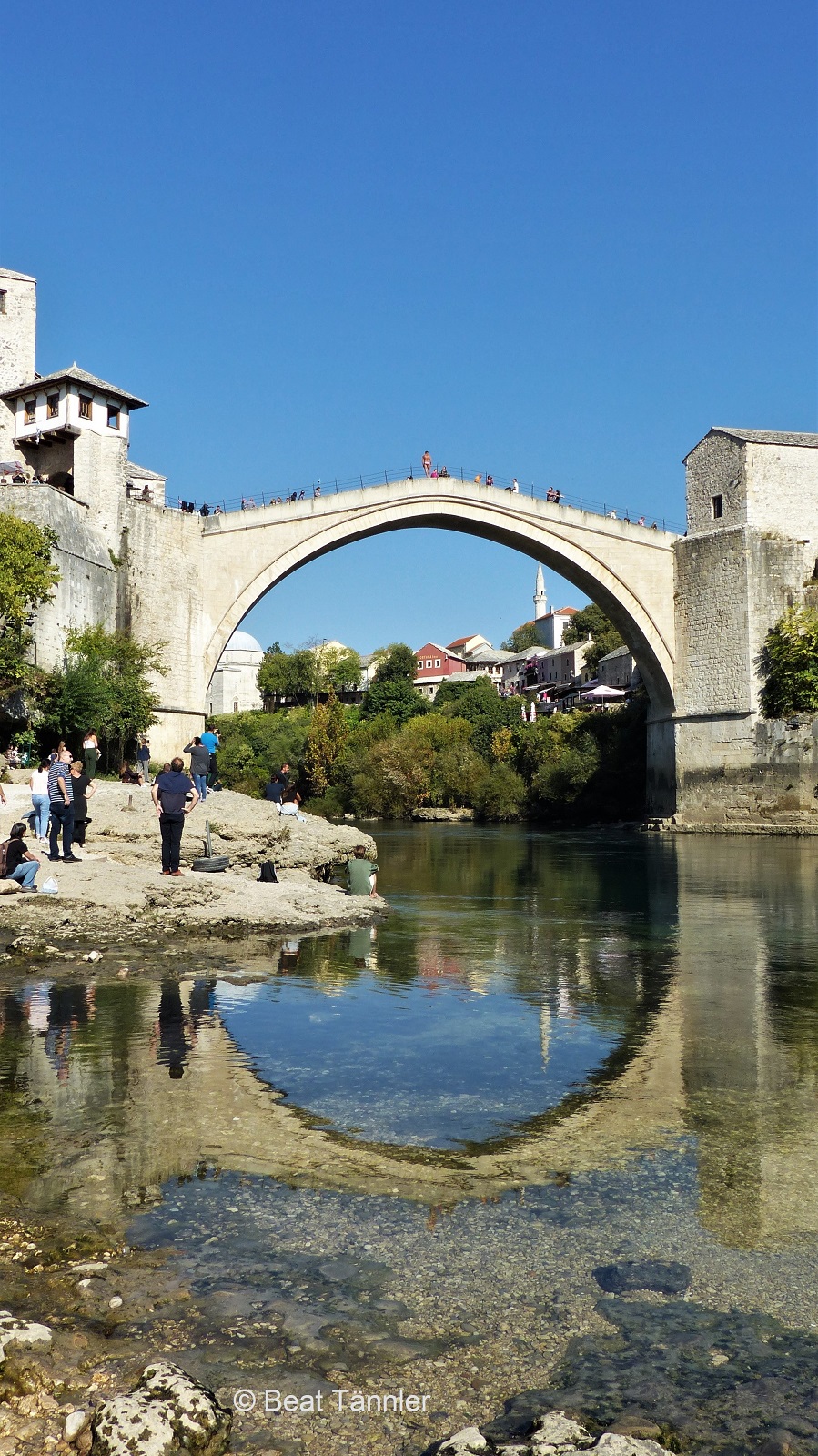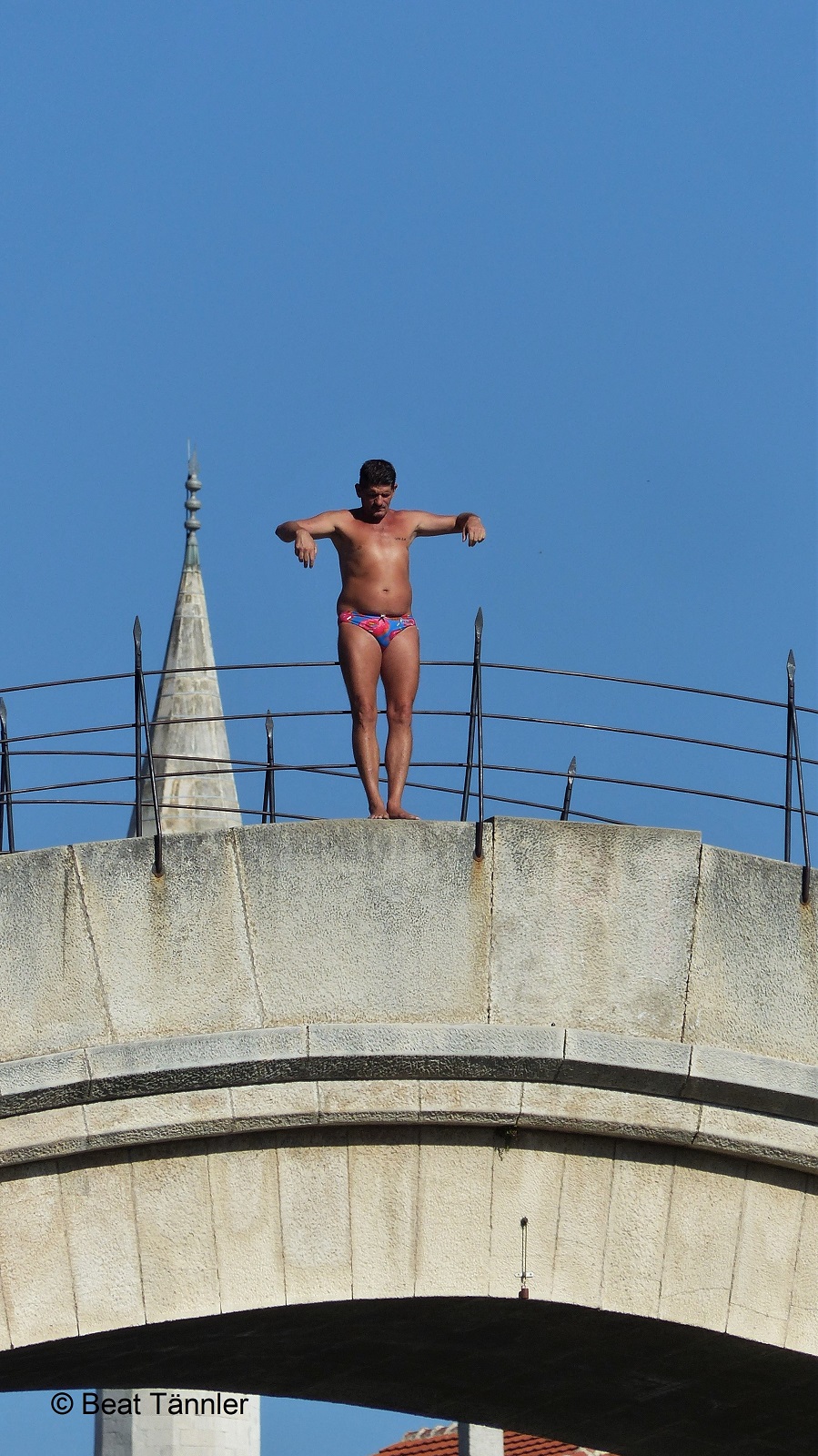 Wir bewundern die imposante Brücke vom Ufer der Neretva aus, als plötzlich ein Mann in Badehose über das Geländer steigt …
